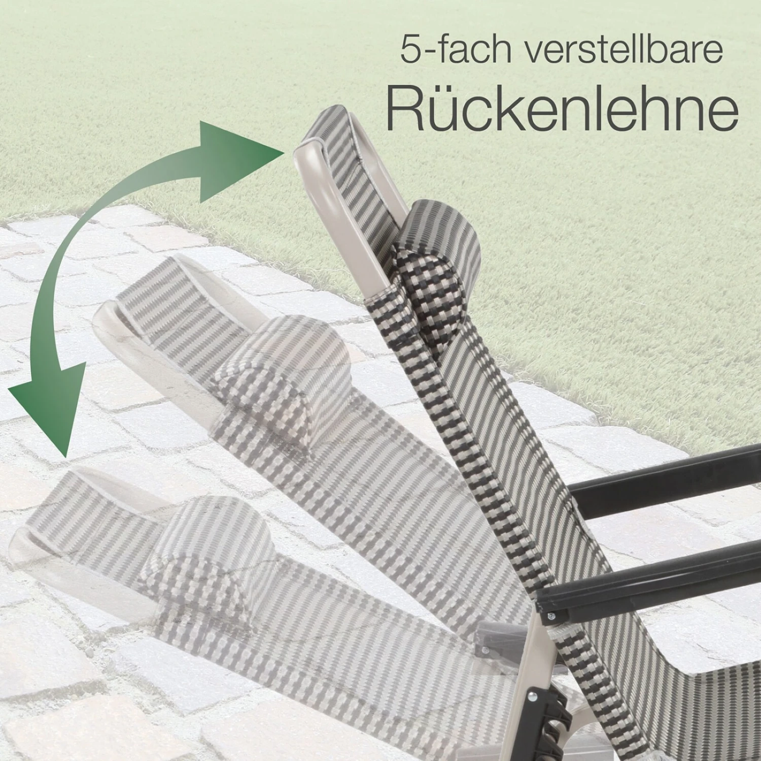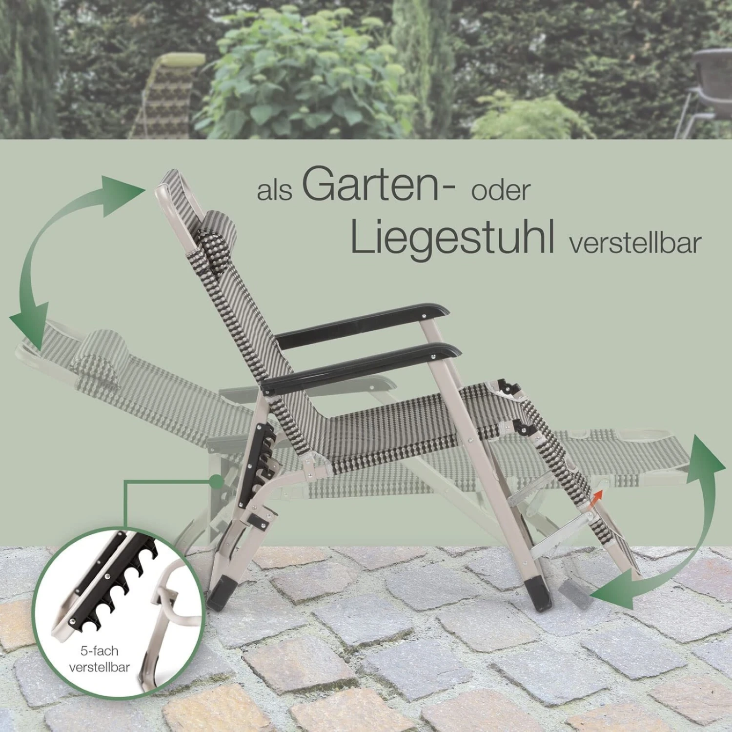 Mit der 5-fach einstellbaren Rückenlehne und der mehrstufig verstellbaren Fußstütze können Sie die Relaxliege bzw. den Relaxstuhl in Ihre bevorzugte Liege- oder Sitzposition zum Relaxen, Lesen, Sonnenbaden usw. einstellen.