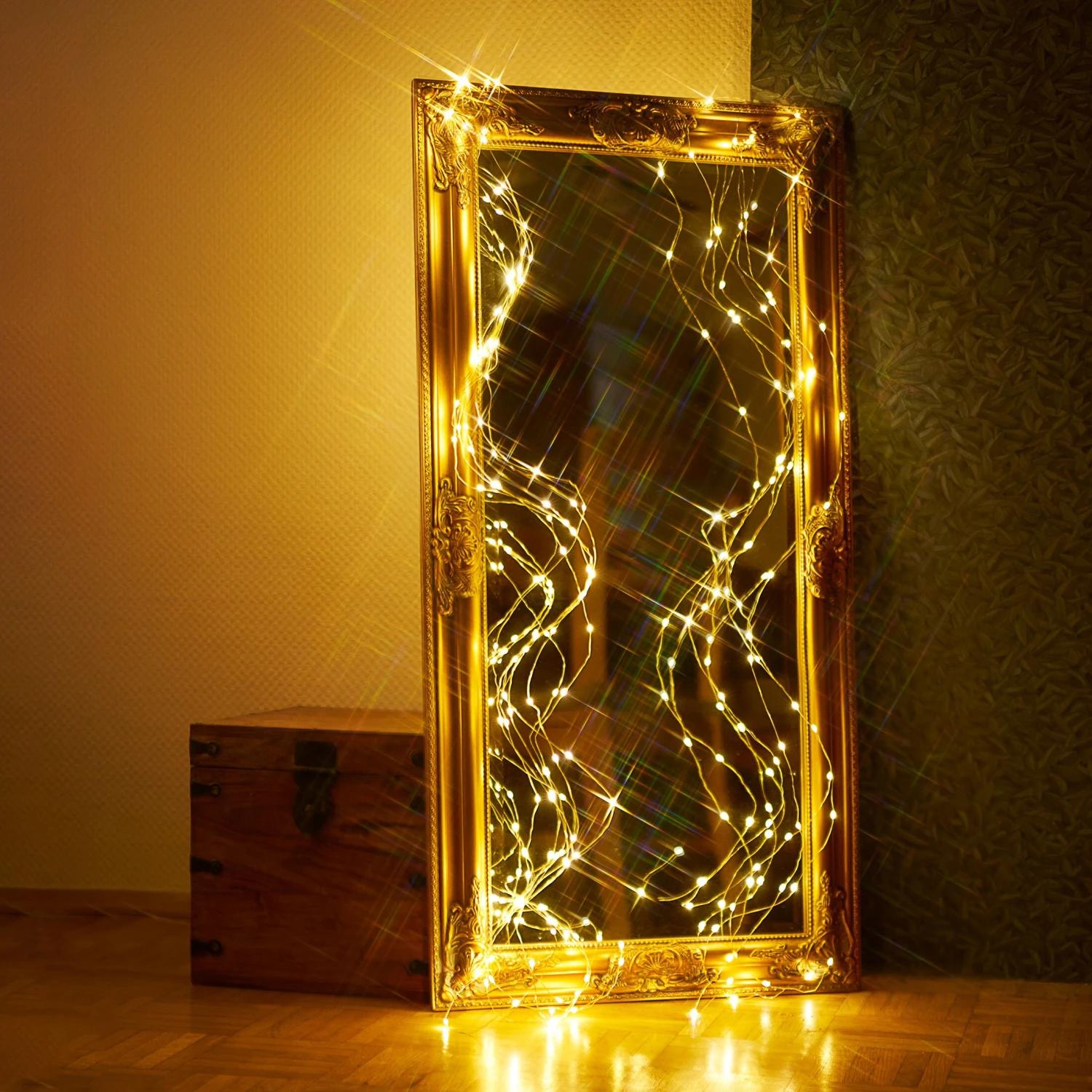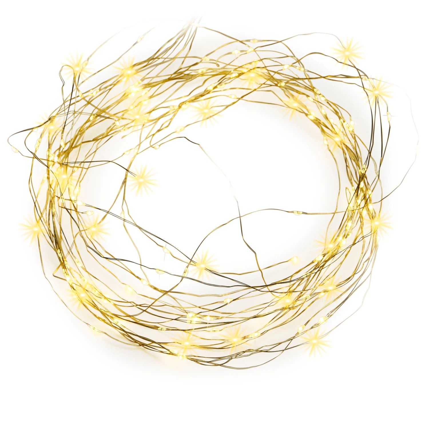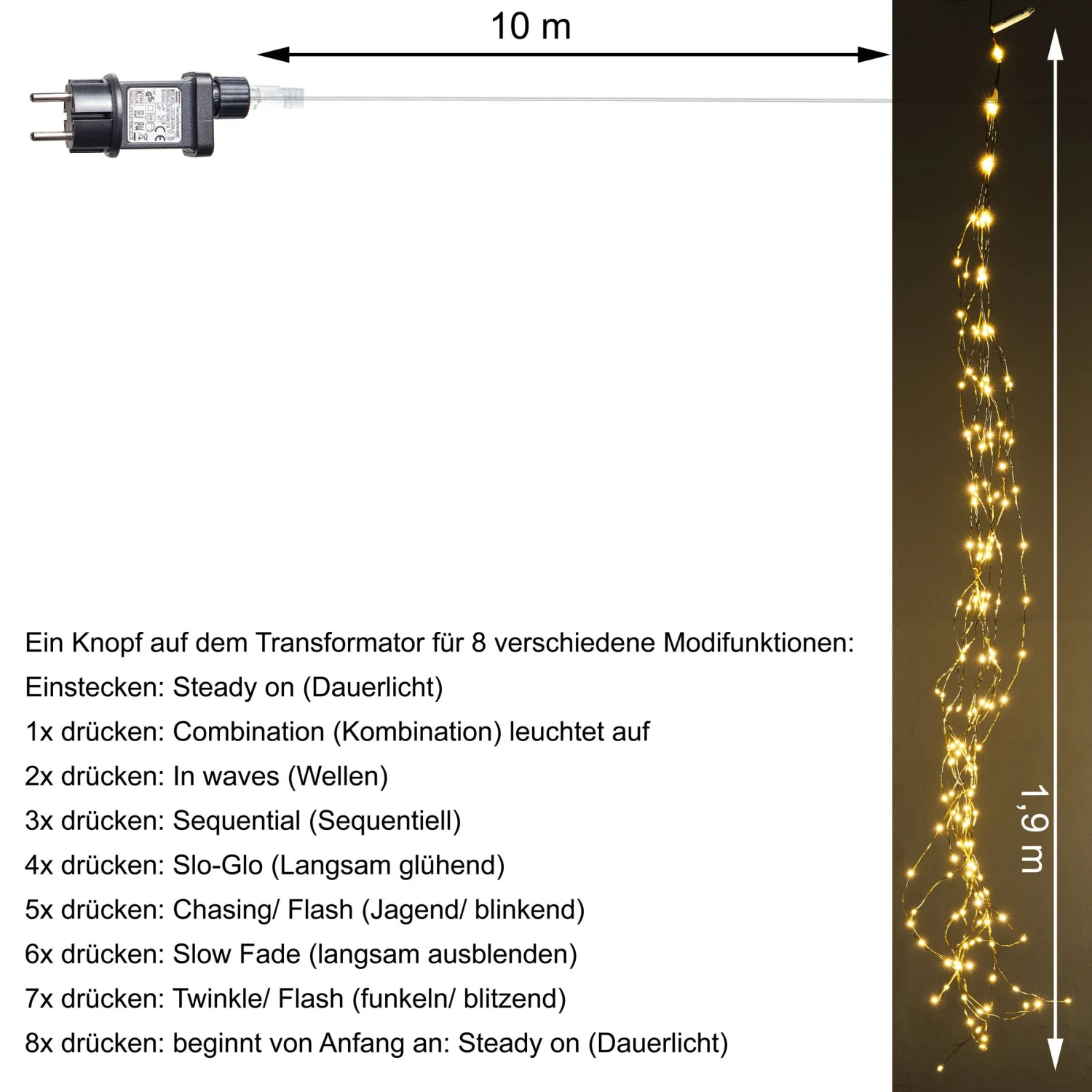 Die LED-Lichterkette von AMARE ist pro Strang 1,9 m lang sowie mit einem Dimmer und einer Fernbedienung ausgestattet. Sie eignet sich für innen und außen. Die Zuleitung (transparentes Kabel) ist 5,0 m lang. Die Lichterkette besteht aus zehn Strängen mit je 20 LEDs zu je 3,0 V / 0,06 W. Die Gesamtleistung der Kette beträgt 4,5 V DC / 3,6 W. Der Adapter ist ein IP44-gesicherter Außentransformator mit einem 6-h-Timer, vier Dimmstufen und acht verschiedenen Modifunktionen, darunter Dauerlicht, warme Wellen, sequentielles Leuchten, langsam glühend oder auch langsam ausblendend und funkelnd.