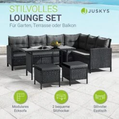 Juskys Gartenlounge Manacor Schwarz – Sofa, Tisch, Hocker & Kissen – 7 Personen – Sitzbezüge In Grau
