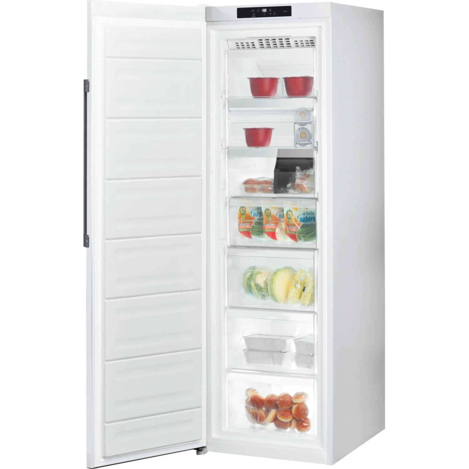 Der Gefrierschrank Bauknecht GKN 19G3 WS 2 stellt einen Nutzinhalt von 263 Litern zur Verfügung und ist mit fünf Gefriergutschubladen, davon zwei XXL-Boxen, sowie zwei Gefrierfächern mit Klappe ausgestattet. Dank der NoFrost-Technologie wird die Luft im gesamten Gefrierinnenraum kontrolliert und gleichmäßig verteilt. Dadurch entstehen keine Vereisungen mehr und Abtauen ist Schnee von gestern. Mit der blitzschnellen Supergefrier-Funktion können größere Mengen an Lebensmitteln schnell und schonend eingefroren werden. Die Temperatur- und Funktionssteuerung des GKN 19G3 WS 2 erfolgt bequem über das innenliegende Touch Display und mit dem EasyOpen Ventil lässt sich die Tür mühelos mehrfach öffnen und schließen. Im Falle einer Störung oder eines Stromausfalls bleibt das Gefriergut im Gerät noch bis zu 24 Stunden vor dem Auftauen geschützt. Mit einem Stromverbrauch von 242 kWh im Jahr ist der GKN 19G3 WS 2 in die Energieeffizienzklasse E eingestuft.