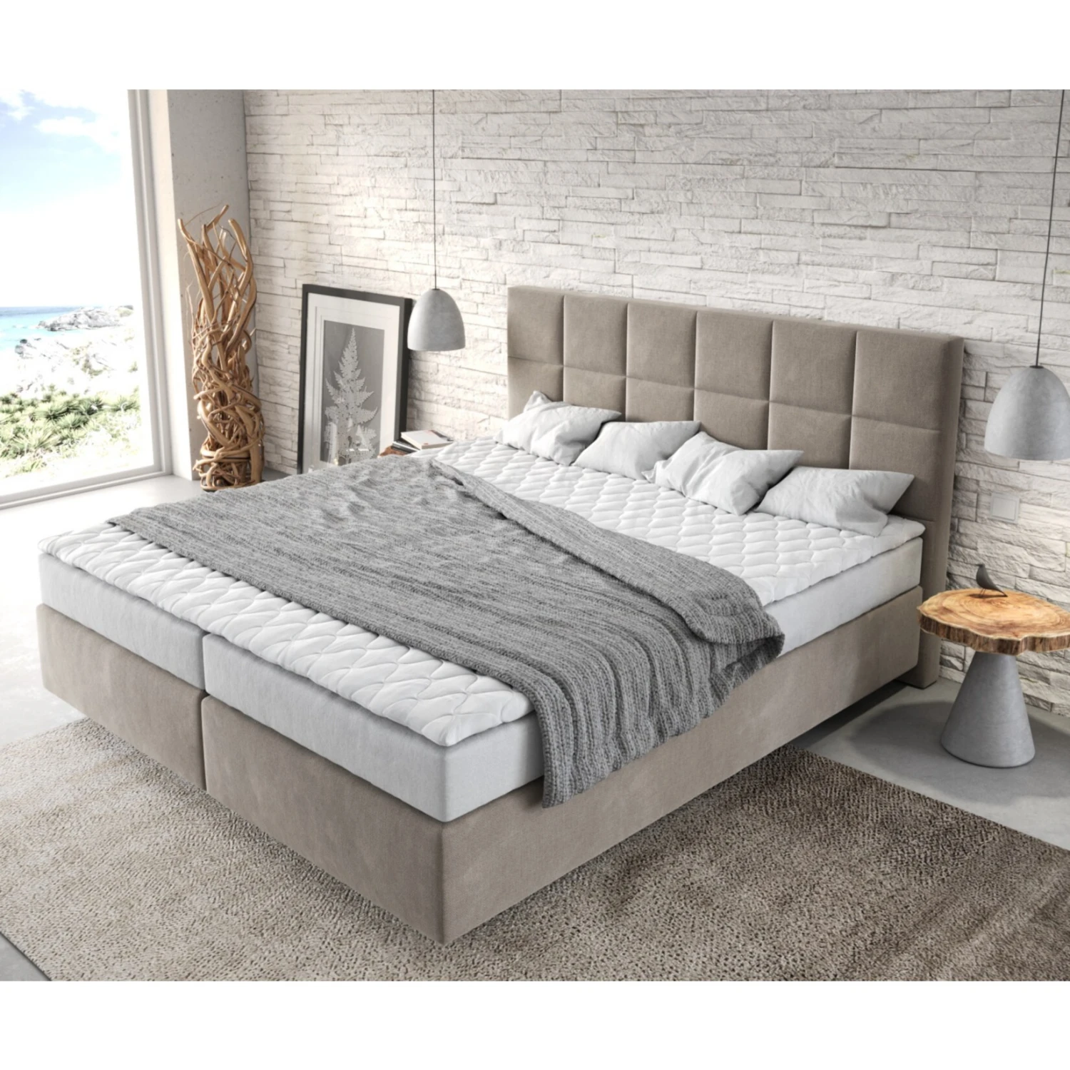 Mit dem Boxspringbett erhalten Sie einen Satz mitgelieferter Füße in eleganter Aluminium Optik. Diese können Sie nach Belieben sichtbar im vorderen Bereich oder versetzt nach hinten montieren, um eine schwebende Optik des Bettes zu erreichen. Die Boxspringbetten sind auch ohne Matratze erhältlich und können mit anderen Matratzen versehen werden. So können Sie sich das Bett zusammenstellen von dem Sie immer geträumt haben. Die weiche Oberfläche des pflegeleichten Bezugs passt dank des gut kombinierbaren, kühlen Beigetons in viele Einrichtungen.