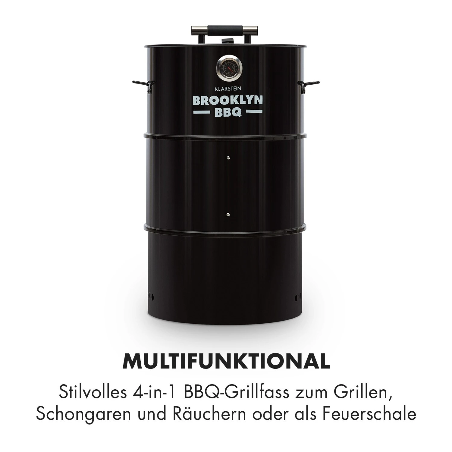 Klarstein Brooklyn-BBQ Grillfass | 4-in-1-BBQ-Grill: Grill, Smoker SlowCooker & Feuerschale | Grill: 42 cm Ø | integriertes Thermometer | Räucherfass mit Rack-Einsatz, 6 Haken und Wasserschale | pulverbeschichteter Stahl | schwarz