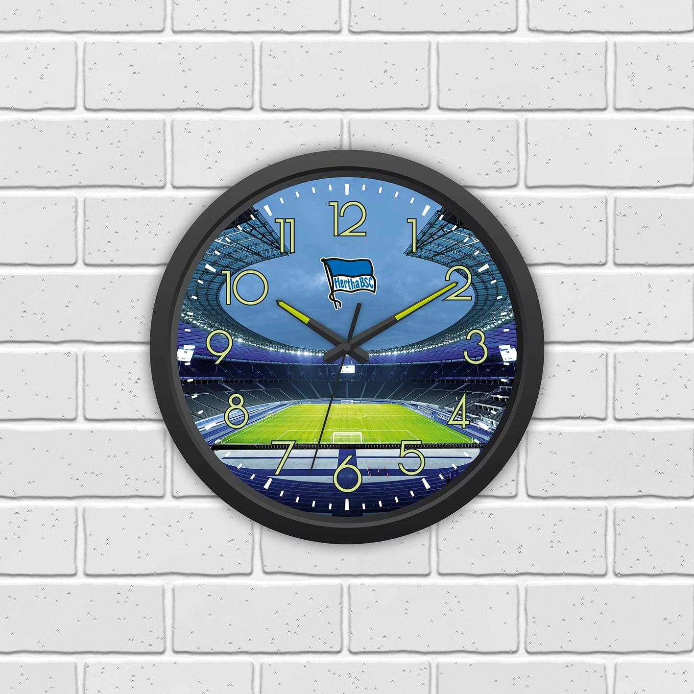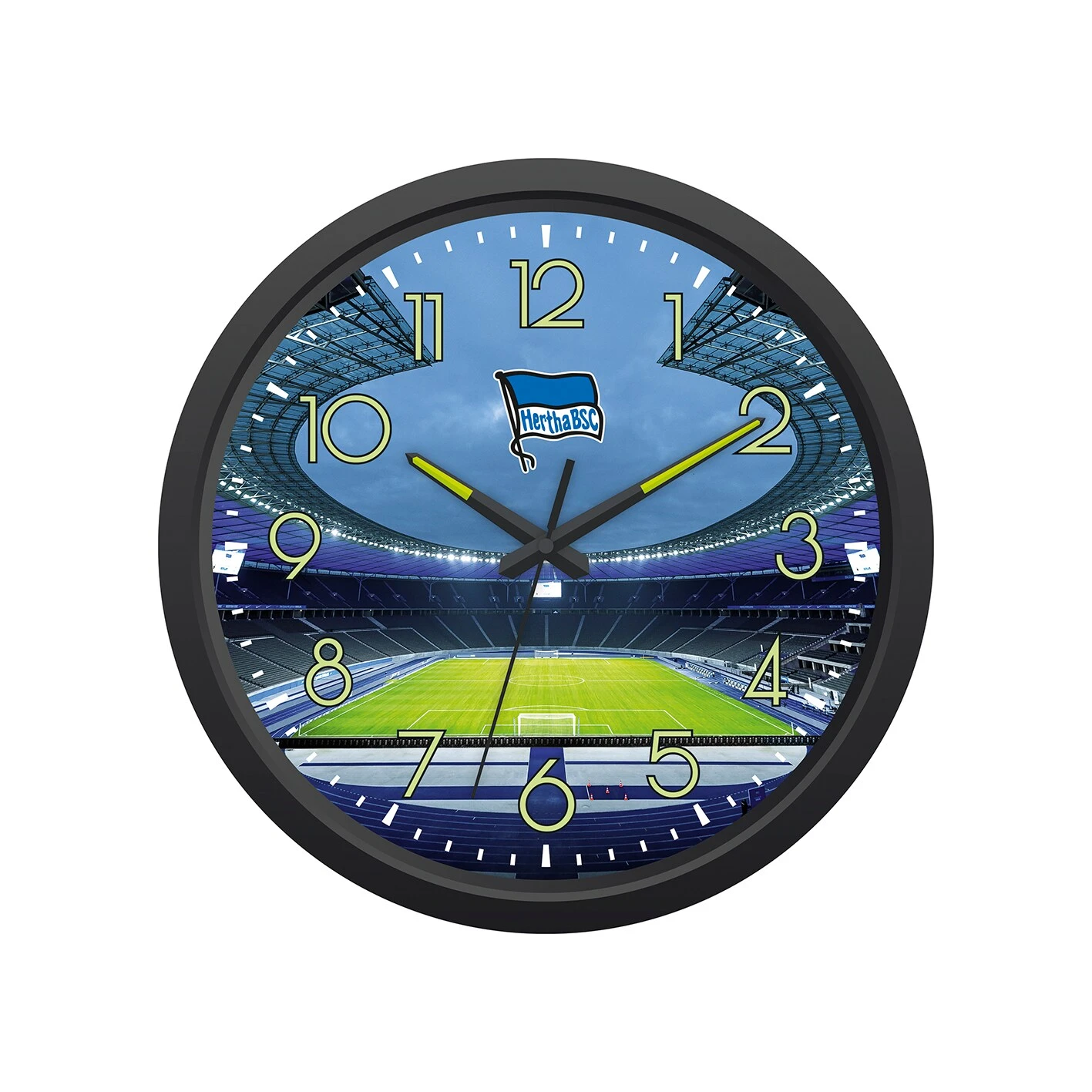 Diese Uhr ist ein echter Hingucker. Mit der „Hertha BSC“ Wanduhr Glow in the dark hast du die Zeit stets im Blick – egal ob im Hellen oder im Dunkeln. Die nachleuchtenden Ziffern und Zeiger auf der Uhr ermöglichen den coolen Effekt. Mit der „BSC“ Wanduhr Glow in the dark machst du deutlich, welcher Verein deine Heimat ist. Mit BSC-Stadion als Hintergrundbild und schwarzem Rahmen.