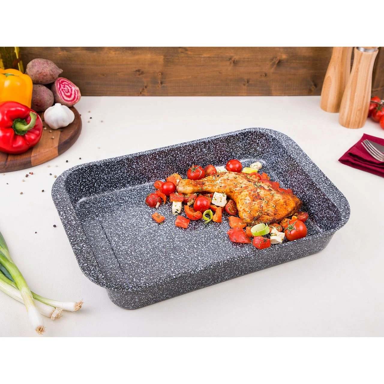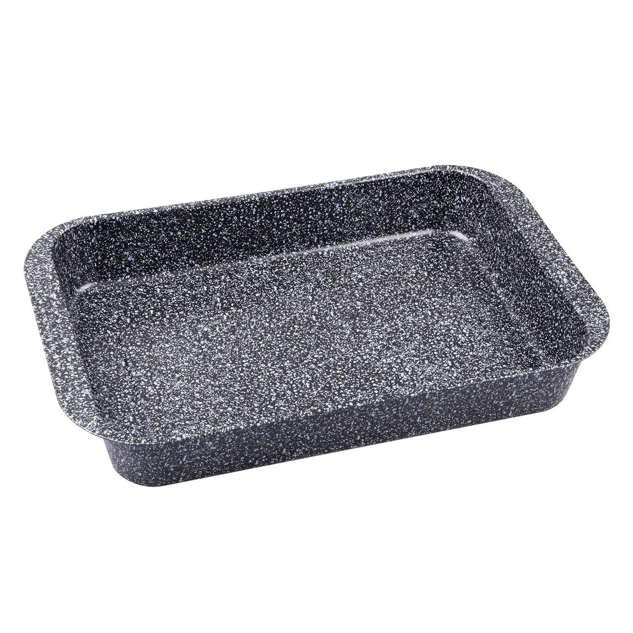 Die Bratenform Granito im Anthrazit-metallic ist extra tief und kann gleichzeitig mit Deckel genutzt werden, indem man eine zweite Form auf die Griffmulden und Arretierungspunkten setzt. Dank der hochwertigen ILAG-Antihaftbeschichtung, ist sie bis 250°C hitzebeständig, hat einen guten Antihafteffekt und ist leicht zu reinigen.
