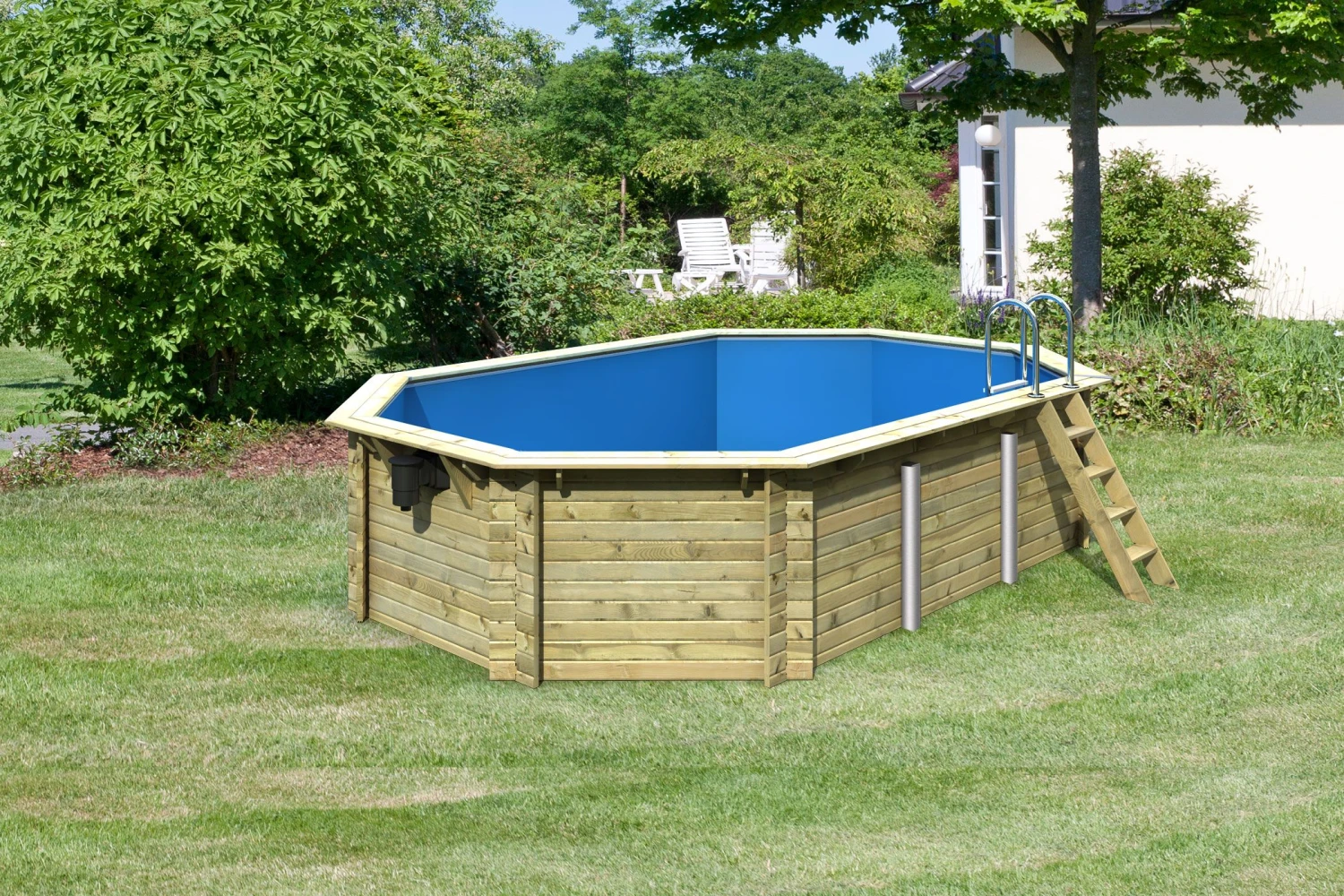 Mit einer Wassertiefe von 111 cm, die sich über die PoolDiagonale von über 6,3 Metern erstreckt, können Sie ganz bequem Schwimmen odersogar Tauchen. Insgesamt warten hier rund 19.000 Liter Wasserinhalt darauf, vonIhnen erobert zu werden. Der Einstieg gelingt bequem über die mitgeliefertenEinstiegsleitern aus Edelstahl für die Innenseite und Holz für die Außenseite.