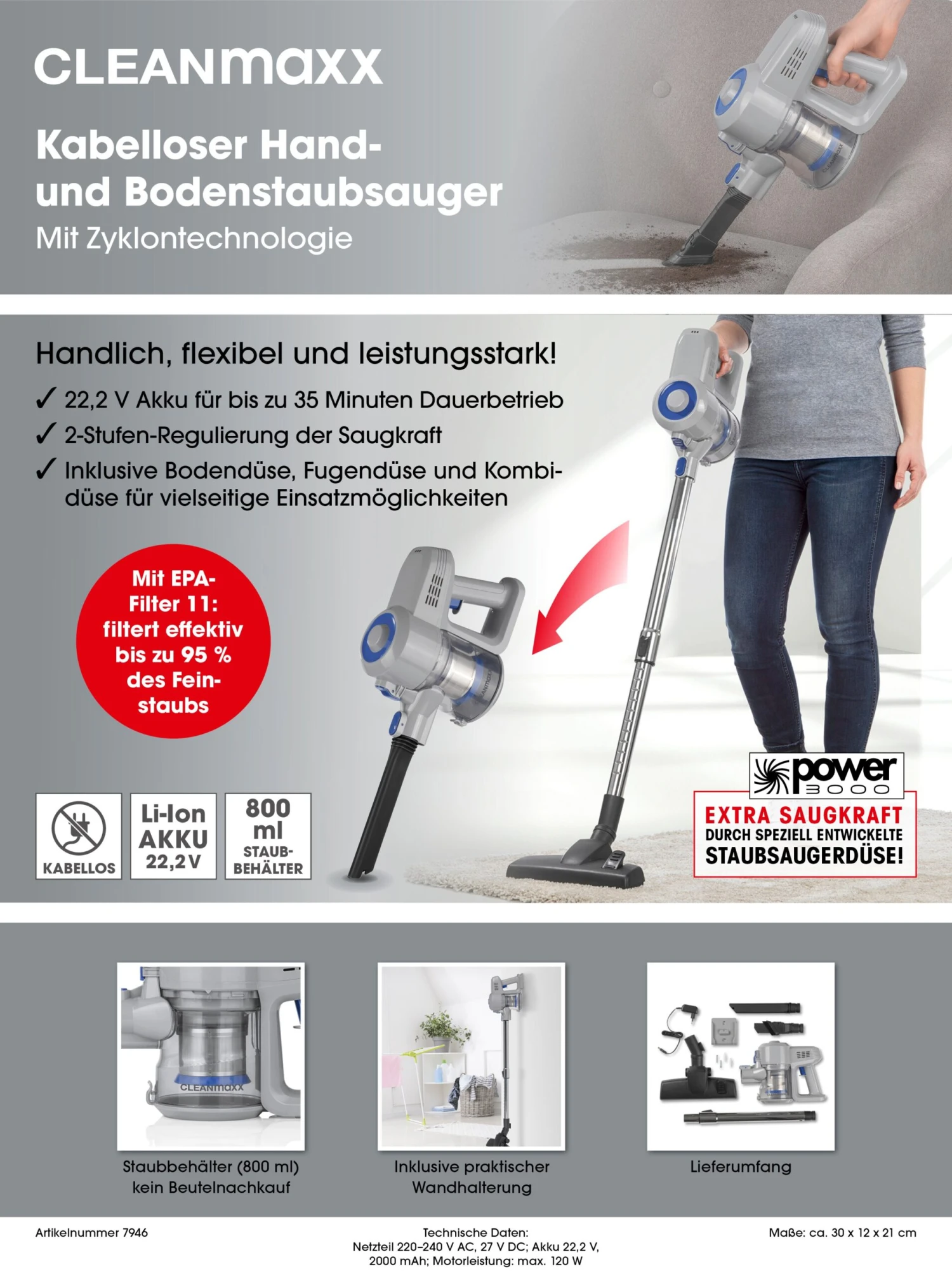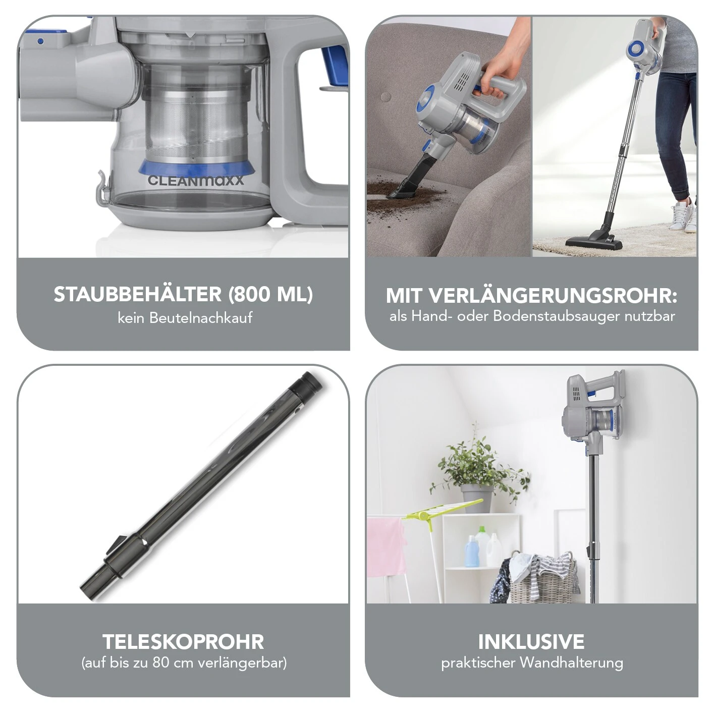 Schmutz, Krümel & Co. einfach wegsaugen – egal wo sie liegen! Mit dem kabellosen Hand- und Bodenstaubsauger von CLEANmaxx haben herkömmliche Bodenstaubsauger ausgedient. Dieses Kraftpaket ist sowohl als Hand- als auch als Bodenstaubsauger einsetzbar und punktet in Sachen Handhabung, Flexibilität und Saugkraft. Einfach mit dem stabilen, verstellbaren Teleskoprohr ganz nach Bedarf zusammensetzen. So sind Tastaturen, Möbel, Autositze, Teppichböden, Treppenstufen u. v. m. blitzschnell von Staub und Schmutz befreit. Selbst Spinnweben können in Sekundenschnell von der Decke entfernt werden. Die Saugkraft des kabellosen Hand- und Bodenstaubsauger von CLEANmaxx lässt sich einfach in zwei Stufen regulieren und somit an individuelle Bedürfnisse anpassen. So gelangt der Schmutz durch den Edelstahl- und EPA-Filter 11 sicher in den Sauger und landet schließlich im leicht entleerbaren Staubbehälter (800 ml). Für eine rundum saubere Wohnung.