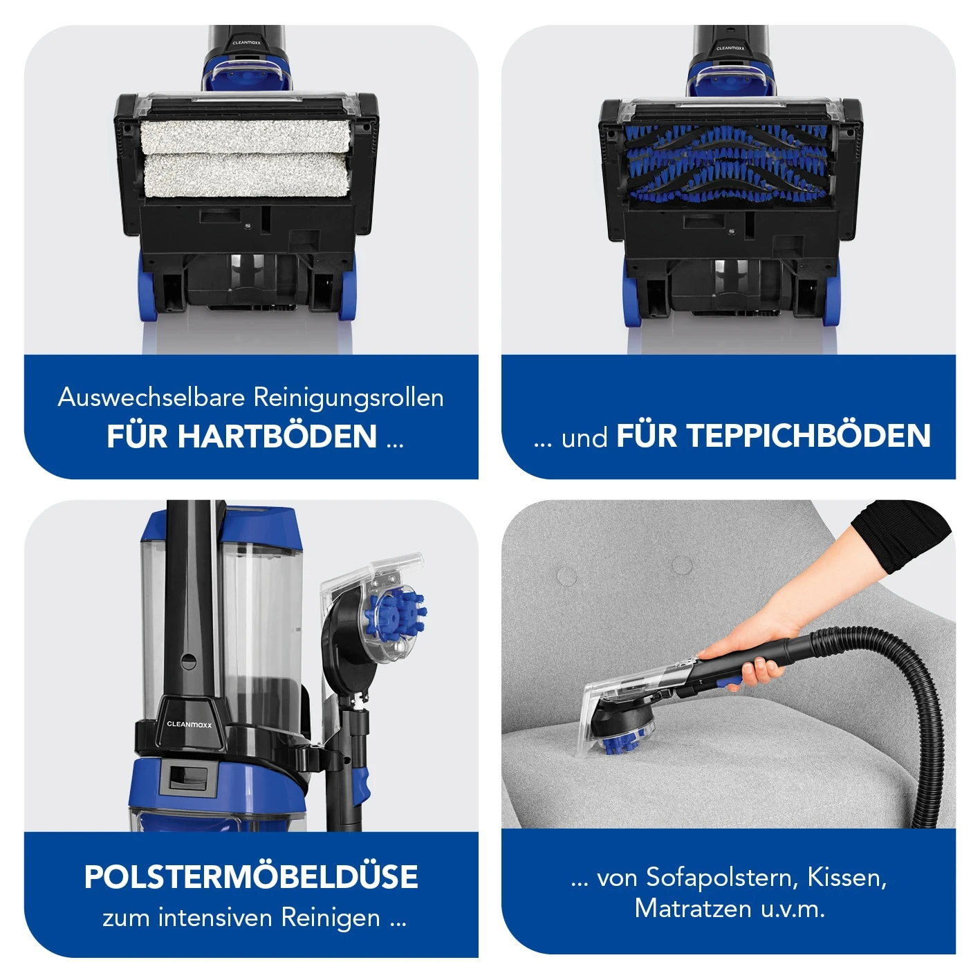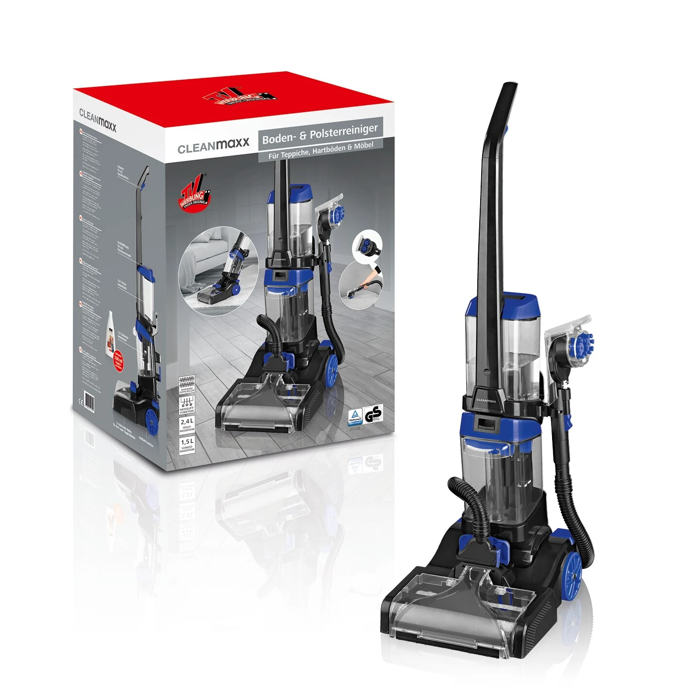 Hier kommt die extra gründliche Reinigung für Ihre Teppiche, Hartböden und sogar Polstermöbel! Der „CLEANmaxx“ Boden- & Polsterreiniger wäscht, reinigt und trocknet Teppiche, Hartböden und Polstermöbel in einem Arbeitsgang – so einfach wie Staubsaugen! Das effektive Reinigungssystem mit jeweils zwei rotierenden Rollen entfernt selbst hartnäckige Verunreinigungen und nimmt Staub und Schmutzteilchen zuverlässig auf. Das Schmutzwasser wird dabei direkt aufgesaugt, die zusätzliche Heißluft-Funktion beschleunigt das Trocknen von Böden. Der extra lange Schlauch macht die Handhabung der Polsterdüse besonders komfortabel. Sie lässt sich nicht nur auf Kissen, Matratzen, Sofas u.v.m. einsetzen, sondern auch zur gründlichen Reinigung von Hartböden aller Art – so werden auch die Fliesen in Bad und Küche endlich wieder richtig sauber. Mit dem „CLEANmaxx“ Boden- & Polsterreiniger holen Sie sich einen wirklich vielseitigen Haushaltshelfer nach Hause und verpassen Ihren Teppichen und Polstermöbeln eine wahre „Beauty-Kur“! Mit jeweils 2 auswechselbaren Reinigungsrollen für Hartböden und Teppiche.