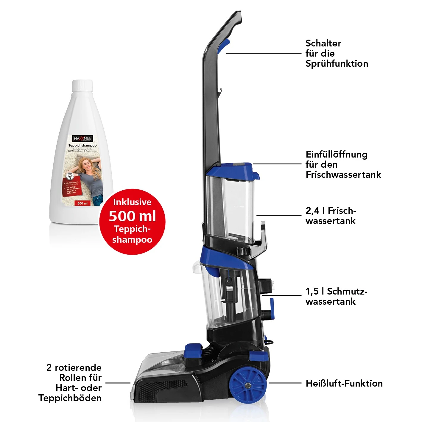 Inklusive 500 ml Teppichshampoo, aufsteckbarem Schlauch (2,5 m), Borstenreiniger und Polsterdüse