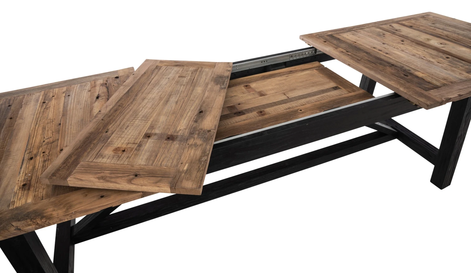 Das integrierte Schienensystem ermöglicht ein einfaches und schnelles Verlängern des Tisches. Für die Stabilität auch im ausgezogenen Zustand dienen Verbindungselemente, die die Platten stabilisieren und wodurch diese nicht verrutschen können.