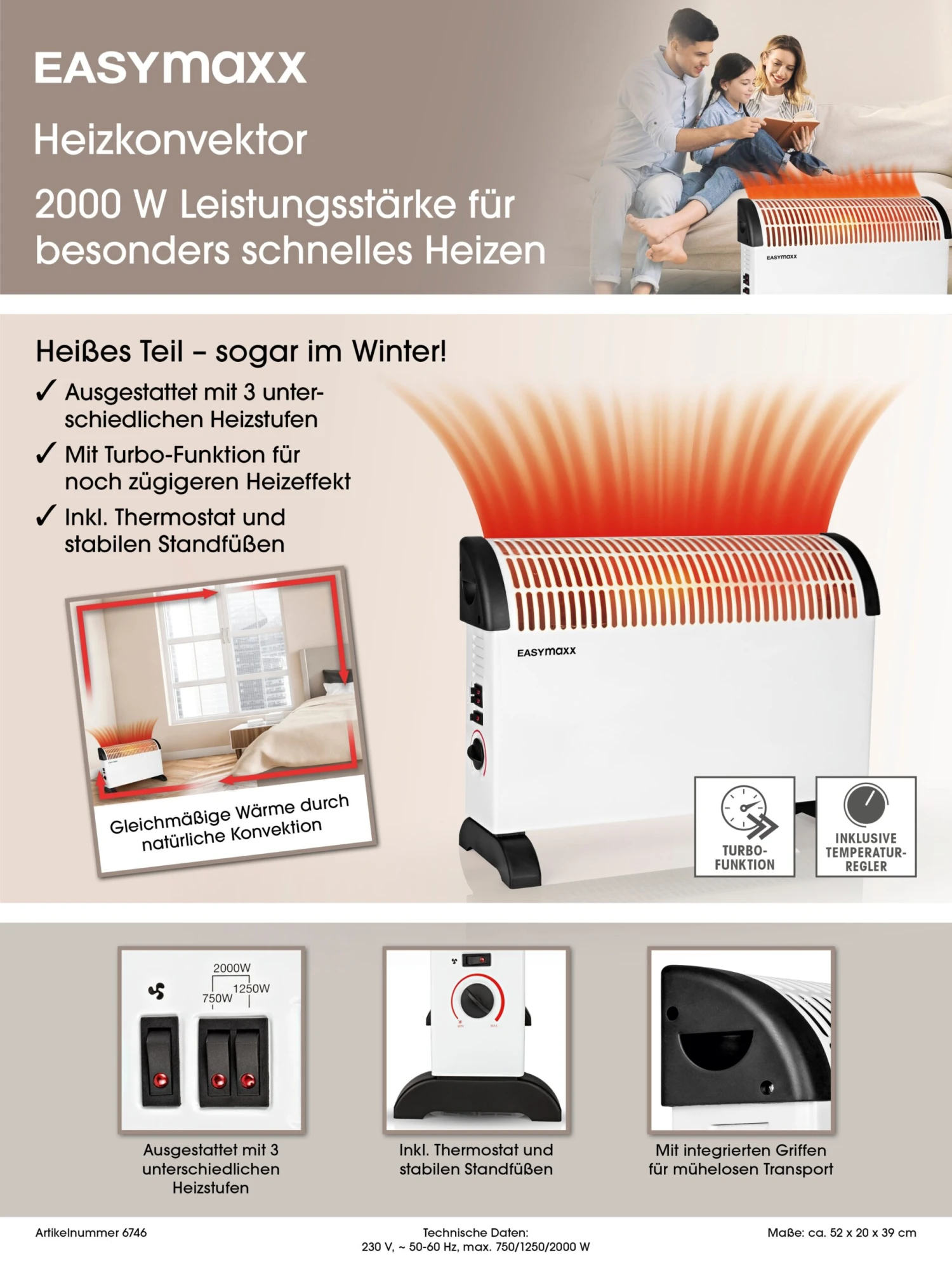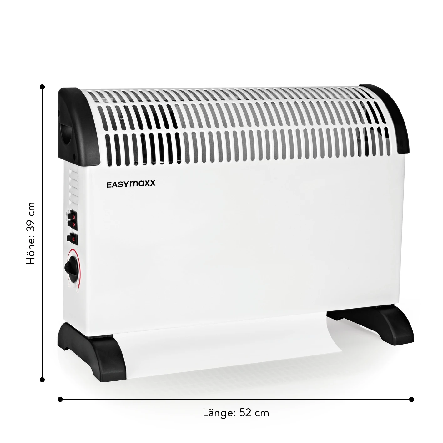 Machen Sie es sich gemütlich – mit kuschelig angenehmer Wärme aus dem EASYmaxx Heizkonvektor. Er ist der optimale Heizkonvektor für zugiges Beheizen von Räumen, da er für gleichmäßige Wärme durch natürliche Konvektion sorgt. Ebenso ist er die perfekte Lösung, sollte Ihre Heizung einmal ausfallen – vor allem im Winter. Dann schafft der Heizkonvektor dank der leistungsstarken 2000 W für schnelle und zuverlässige Wärme, wo auch immer Sie es sich gemütlich machen wollen. Die integrierten Griffe machen dazu einen mühelosen Transport von A nach B möglich. Zum Beispiel ins Schlafzimmer, denn der Heizkonvektor erzeugt wohlige Wärme, ohne dabei laut zu sein. Beheizen Sie Ihre Räume endlich in perfekter Temperatur: Für präzise Regulierungen zwischen ist der Heizkonvektor mit einem Thermostat und zusätzlich mit drei unterschiedlichen Heizstufen ausgestattet! Erleben Sie Wärme, die optimal auf Ihre Bedürfnisse zugeschnitten ist – mit dem EASYmaxx Heizkonvektor. Inkl. Überhitzungsschutz.