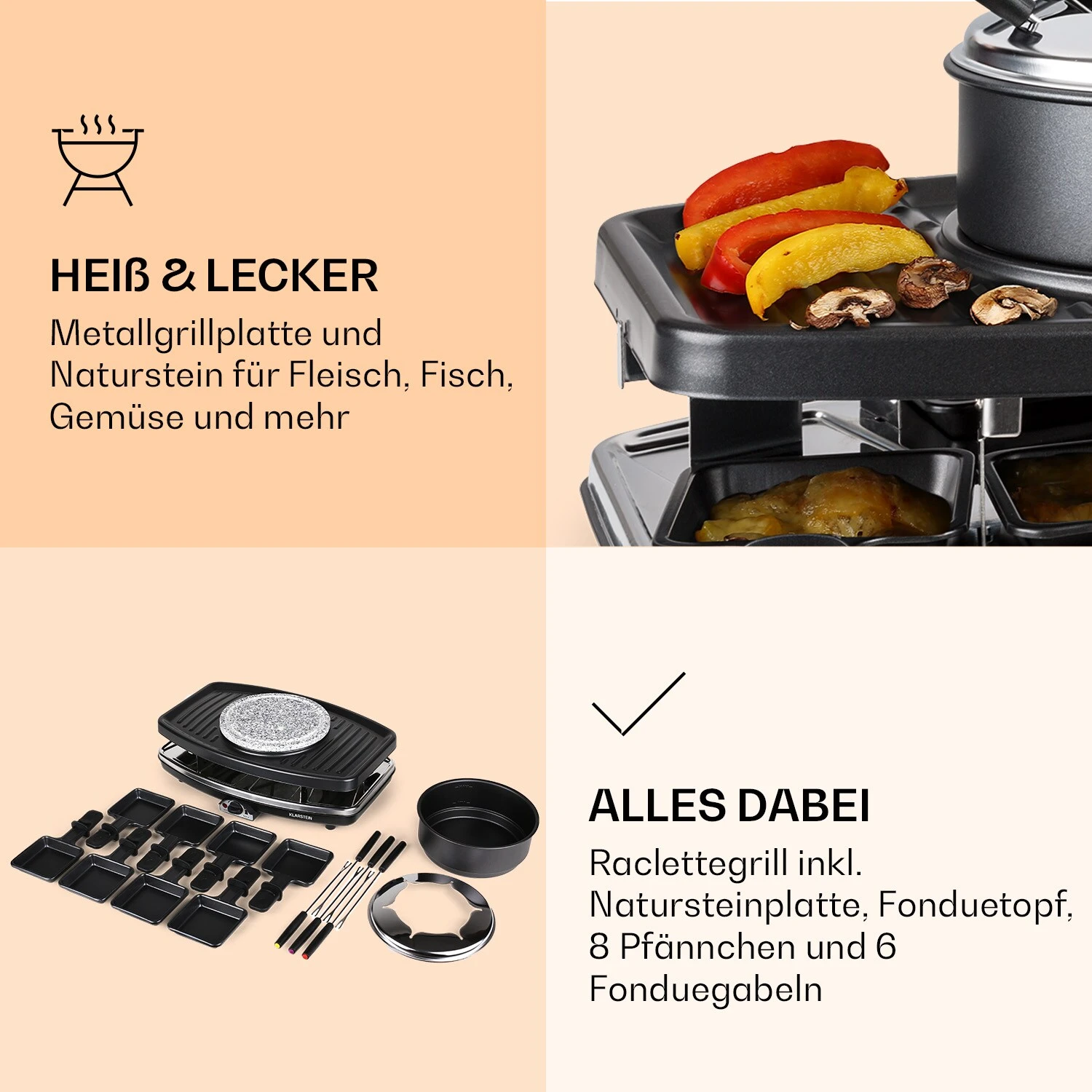 Klarstein Entrecôte 2-in-1 Raclette-Grill & Fondue | 1100 Watt | 2-in-1 Grill: Metall- & Natursteinplatte | Edelstahl-Heizelement | für 8 Personen | 8 Raclette-Pfännchen mit Antihaftbeschichtung | 6 Fonduegabeln | 8 Holzbrettchen | hitzeresistente Griffe | Edelstahl-Basis | schwarz