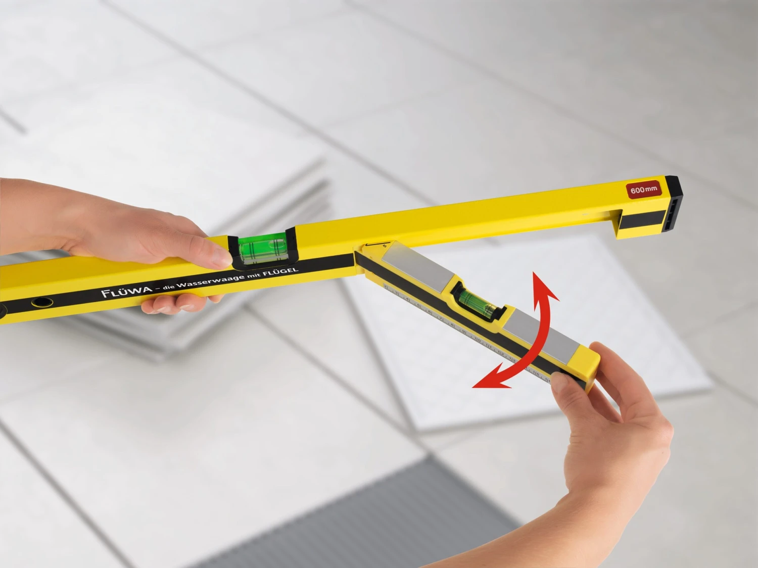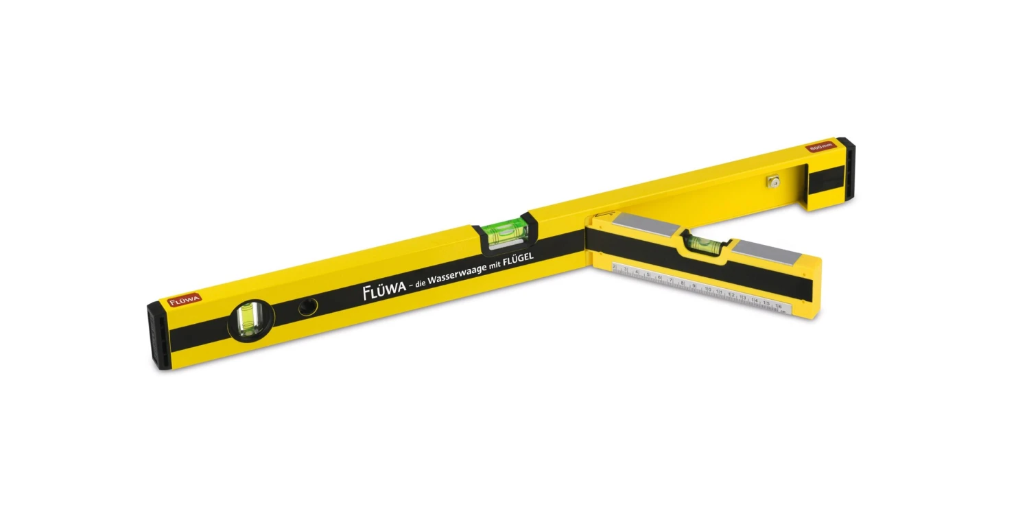 - Wasserwaage mit ausklappbarem Flügel zum gleichzeitigen Nivellieren in zwei Richtungen