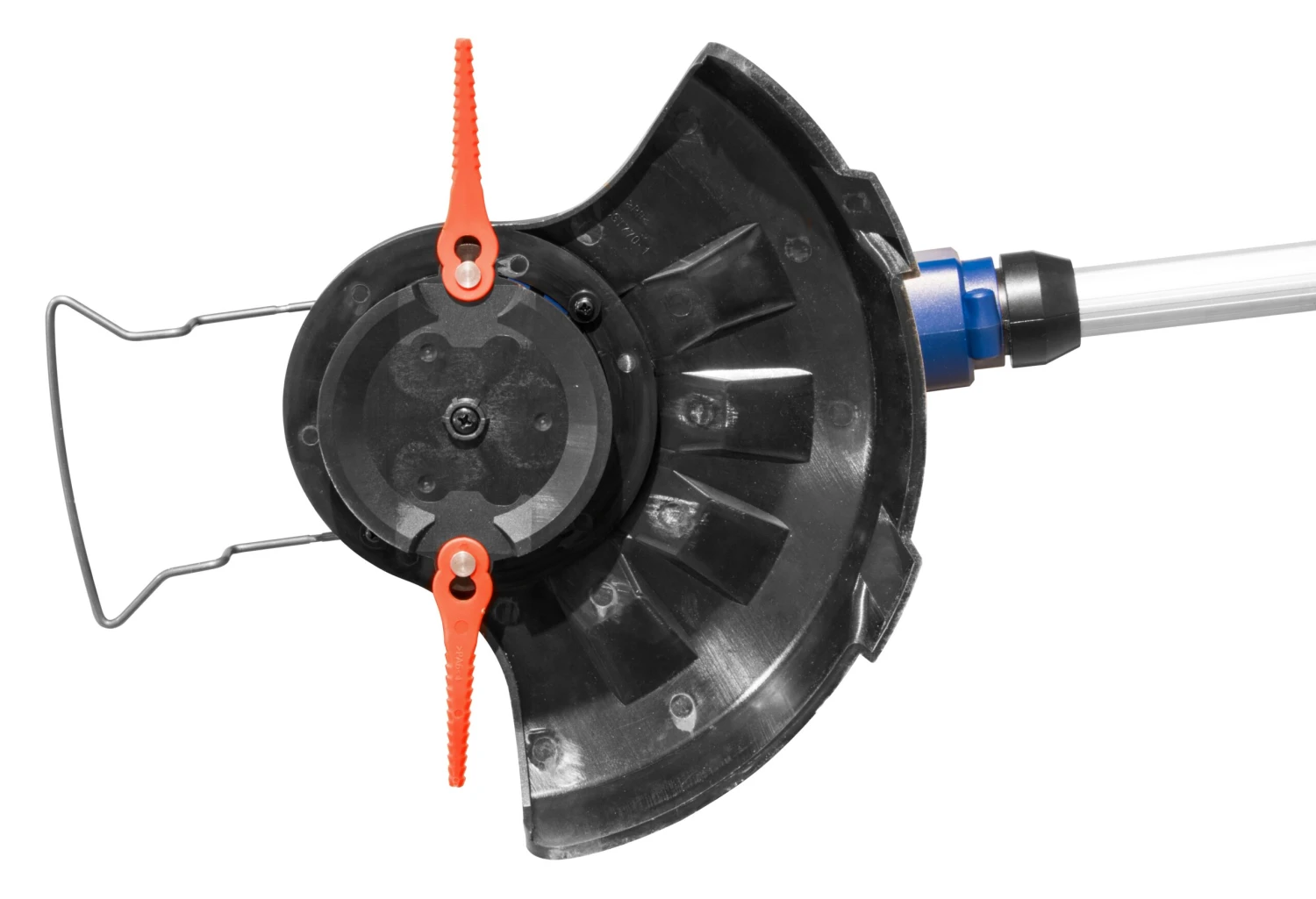 Der Rasentrimmer ist mit einem Doppelmesser ausgestattet. Ein zusätzlich um 180° drehbarer und 5-fach neigbarer Trimmerkopf sorgt für effektives Arbeiten. Ein teleskopierbarer Führungsholm, sowie ein stufenlos verstellbarer Zusatzhandgriff, runden die Ausstattungen des Rasentrimmers ab.
