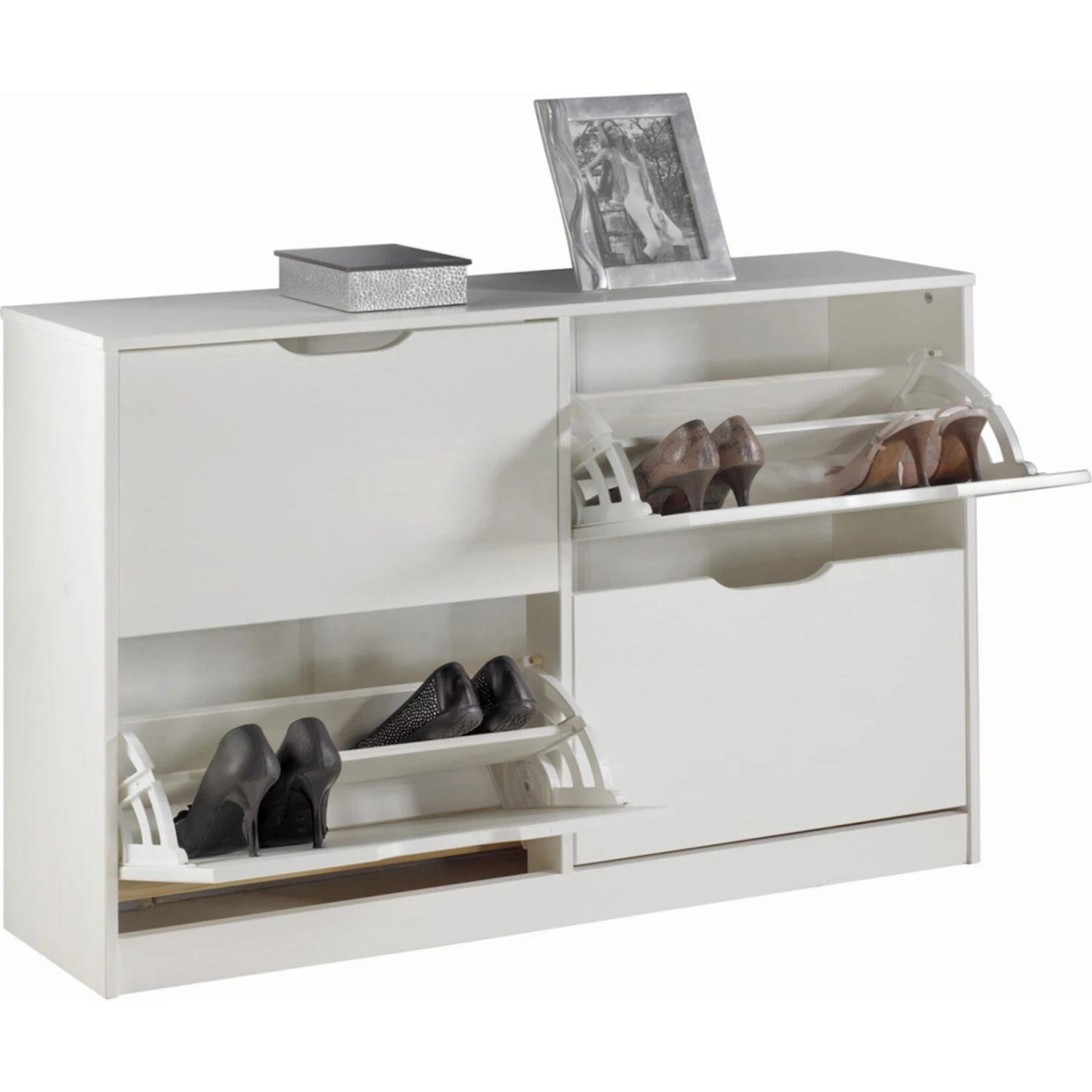– Der Schuhschrank ist aus massivem Kiefernholz gefertigt und in den Farben natur, weiß, honigfarben und graubraun lackiert und mit 2 x 2 oder 3 Kippfächern lieferbar