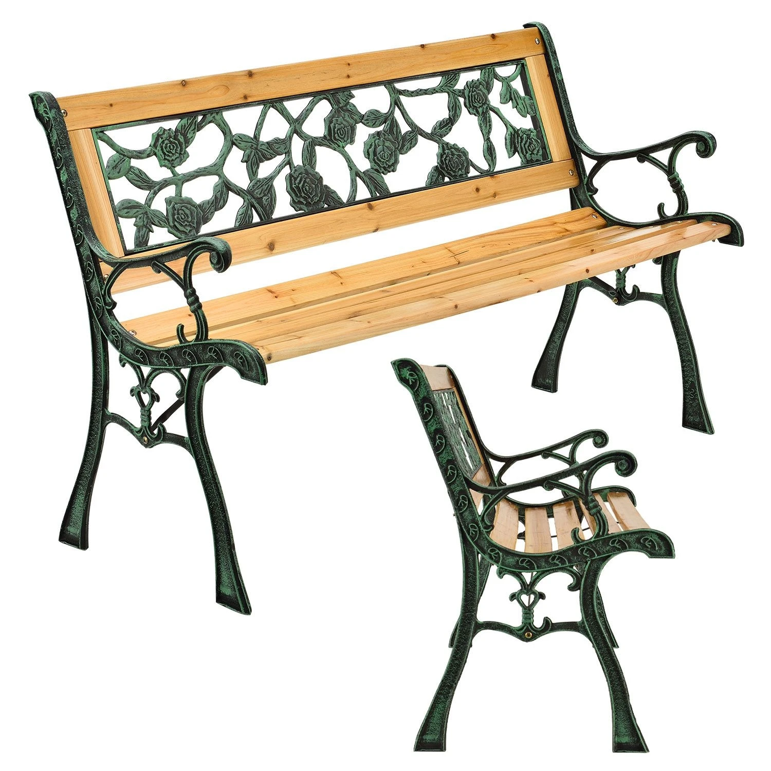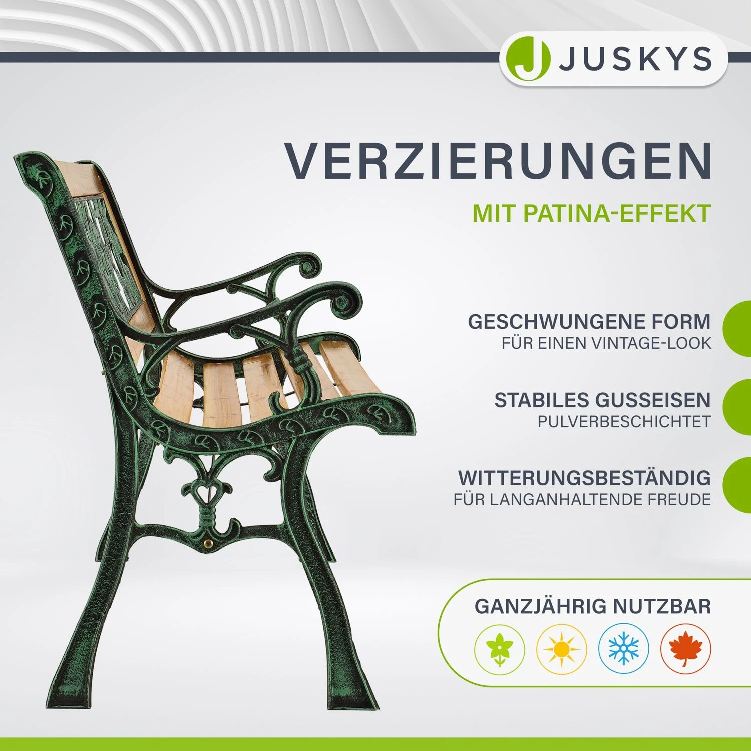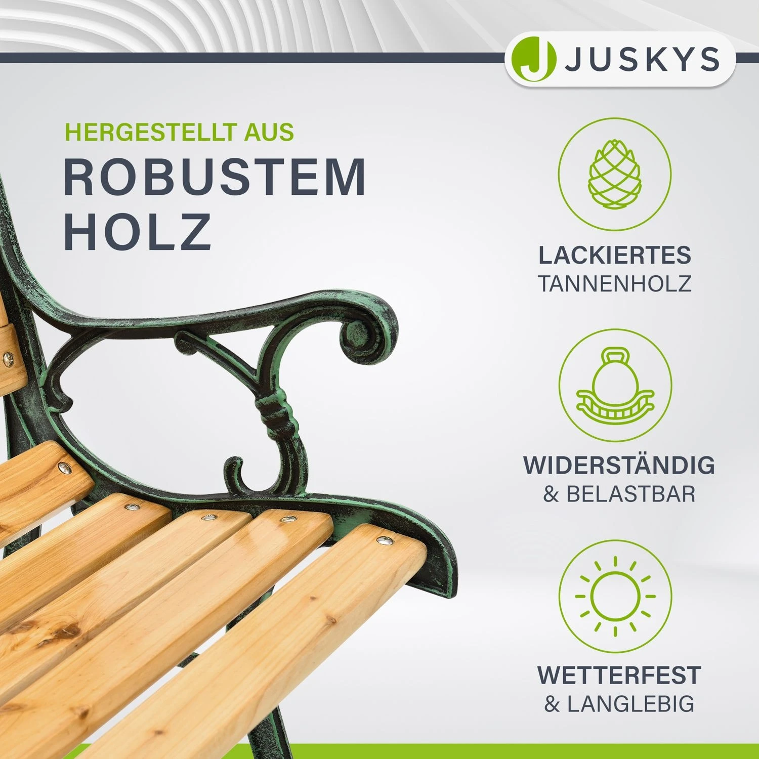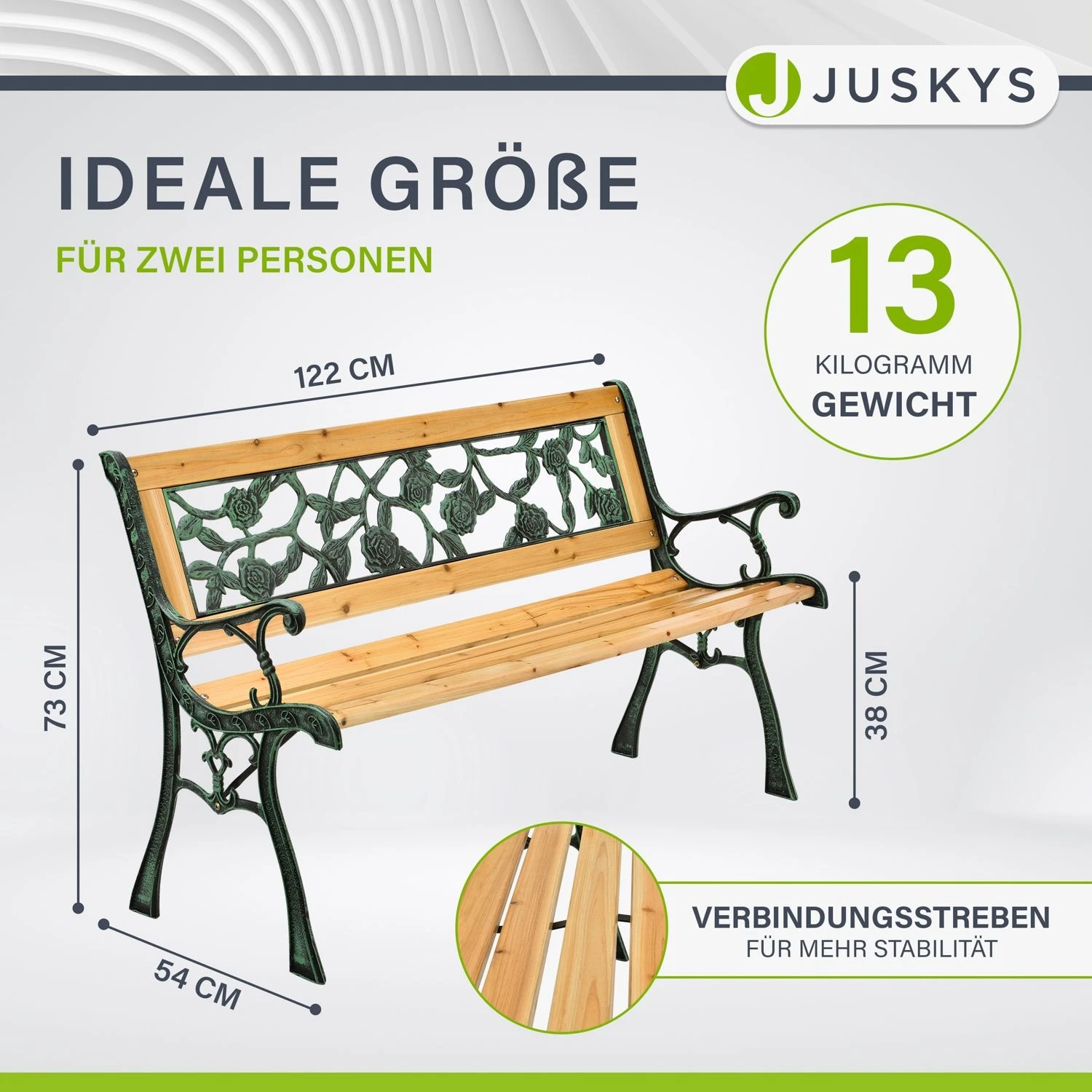 Dank dem 18mm starken Holz-Gestell und dem robusten Gusseisen hält die Parkbank draußen Wind und Wetter stand. Eine Lackierung schützt das Holz vor äußeren Einflüssen, wie Regen und Witterung. Die Beine werden durch Verbindungsstreben mit der Sitzfläche verbunden, was für zusätzliche Stabilität und Langlebigkeit sorgt.