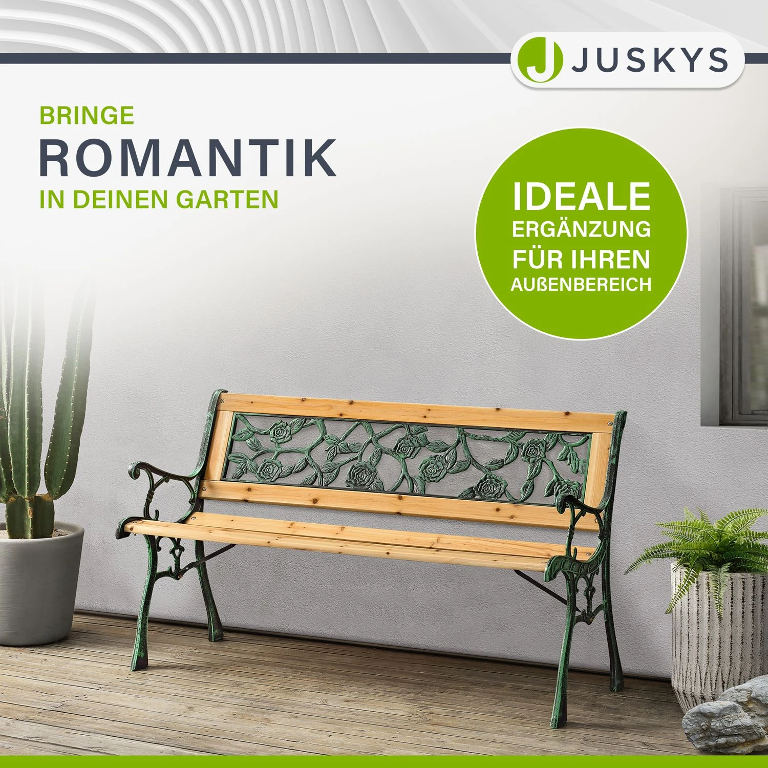 Hübsche Verzierungen und das dekorative Kunststoffelement mit Rosenmuster in der Lehne hauchen der 2-Sitzer-Bank einen ganz besonderen Charme ein. Hinzukommt ein toller Grünspan-Patina-Effekt auf den Seitenteilen, der den Shabby Chic Look komplett macht. Die verträumte Optik lädt zum Verweilen ein.