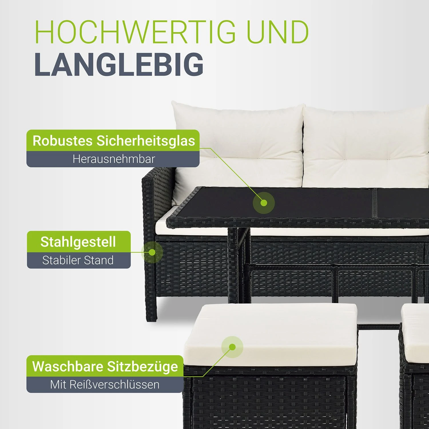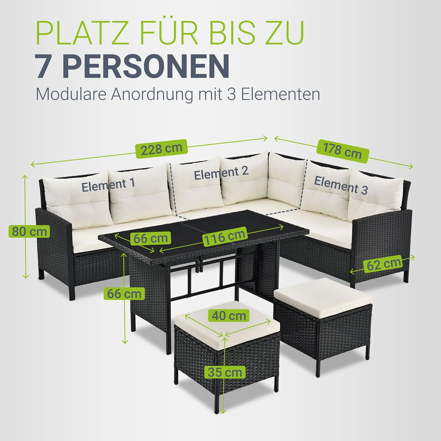 Mit dem Polyrattan Lounge Set Manacor verwandeln Sie Garten, Terrasse oder Balkon in einen stilvollen Ort zum Entspannen und Wohlfühlen. Die große Gartenlounge mit Sofa, 2 Hocker und Tisch bietet bis zu 7 Personen Platz. Weiche Sitz- und Rückenkissen sorgen für ein gemütliches Sitzgefühl. Zum Speisen oder für Gesellschaftsspiele steht Ihnen der große Esstisch zur Verfügung. Gesellige Abende mit Familie, Freunden oder Nachbarn werden so zu einem tollen Erlebnis unter freiem Himmel. Die einzigartige Rattan-Optik verleiht dem Gartenmöbel-Set einen modernen Charme.