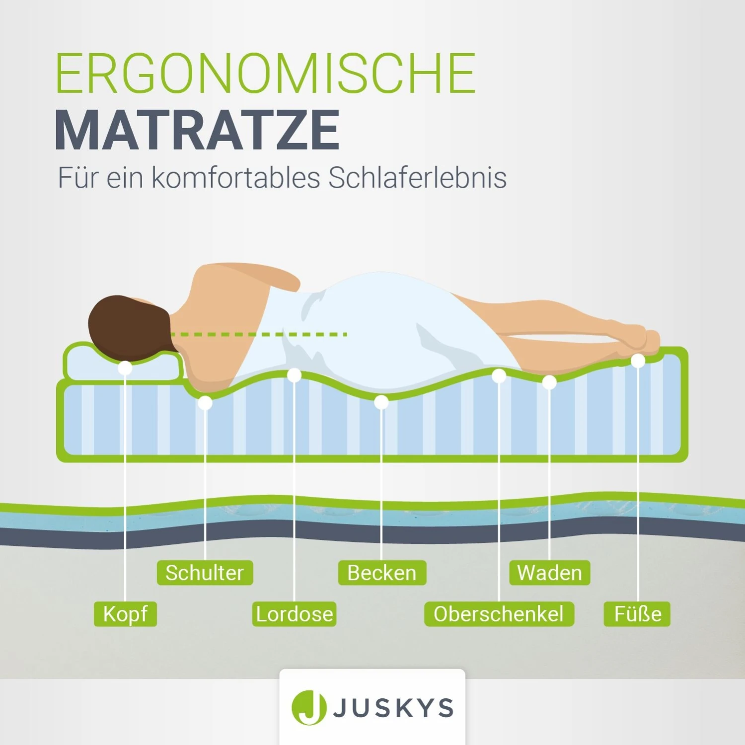 Gönnen Sie sich die hochwertige Kaltschaummatratze. Sie liegen auf hoch verdichtetem Kaltschaum, das sich ergonomisch an Ihren Körper anpasst. Auf diese Weise wird Ihre Wirbelsäule punktelastisch unterstützt. Sie liegen äußerst bequem und können sich nachts wunderbar erholen.
