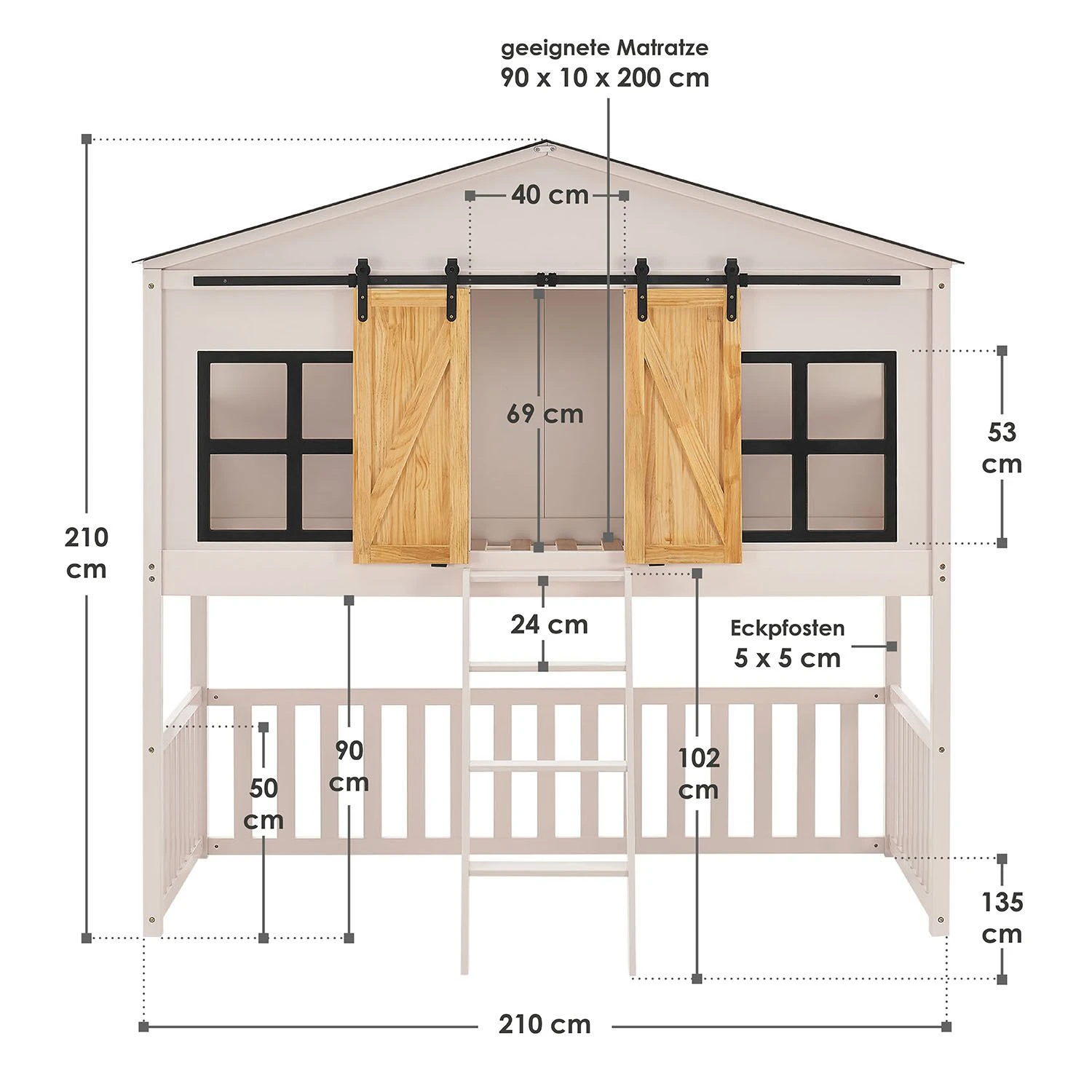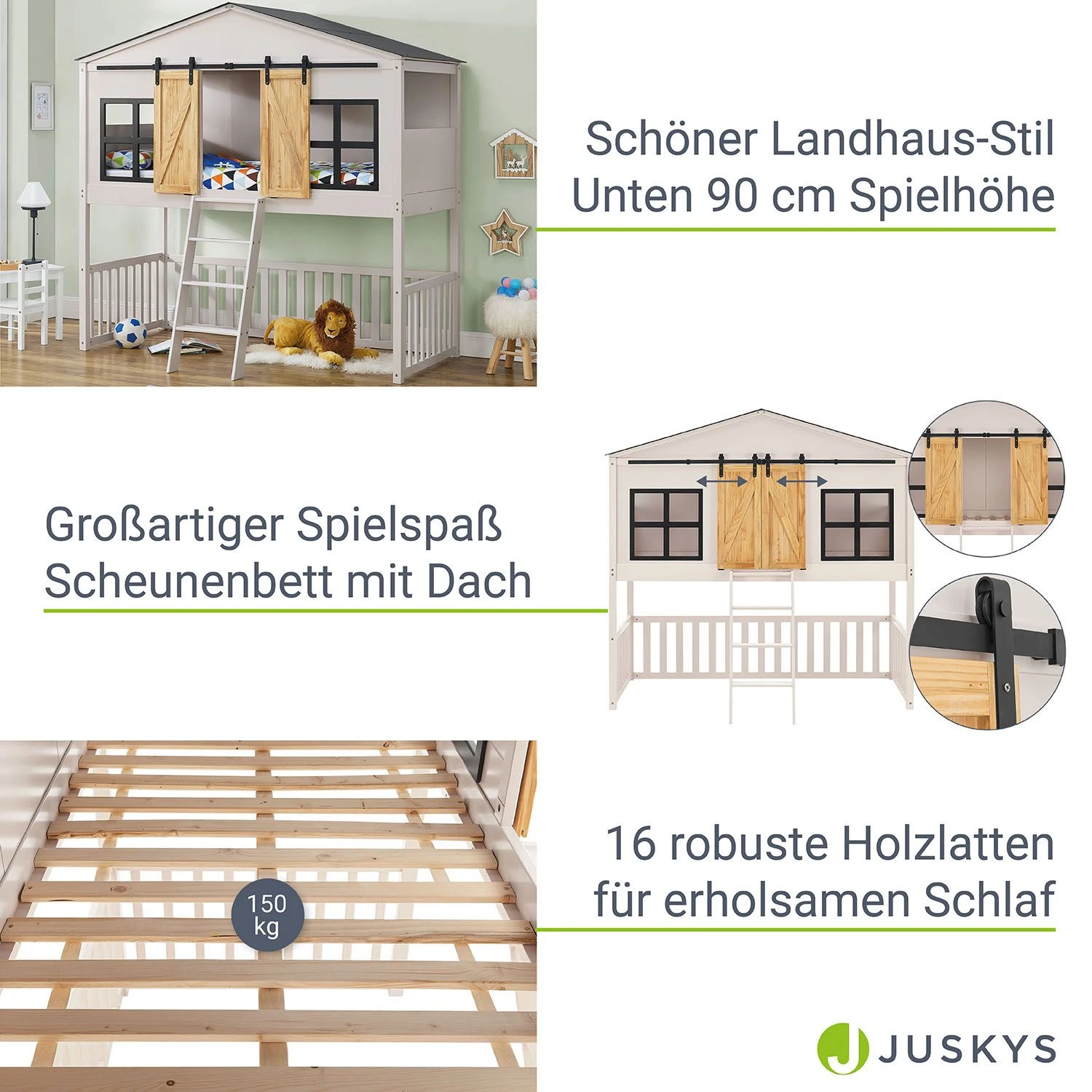 Mit dem modernen Kinderbett Farmhaus verzaubern Sie kleine und große Kinderzimmer in einen kreativen Abenteuerplatz im ländlichen Stil. Als multifunktionales Design vereint es gleich mehrere Funktionen. So ist das 210x135x210 cm (BxLxH) große Bett als Haus mit Dach, Tor und Fenster ein gemütlicher Platz zum Schlafen und Spielen. Oben steht Ihrem Kind das 90×200 cm Bett mit stabilem Lattenrost zur Verfügung. Der Bereich unten dient als zusätzliche Spiel- und Stellfläche – einladend und platzsparend. Als Trendprodukt begeistert das liebenswerte Massivholz Hausbett Mädchen und Jungen sofort. Perfekt für fantasievolles Spielen im Kinderzimmer.