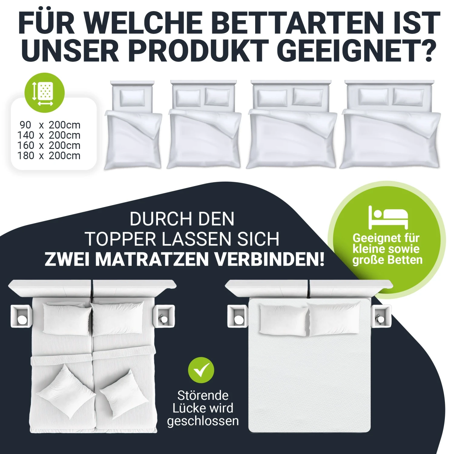 - Einsatzorte: Schlafzimmer, Boxspringbett, Kinderbett, Gästezimmer, Gästebett, Schlafsofa, Wohnmobil, Wohnwagen (z. B. Sitzecke zur Couch umfunktionieren)