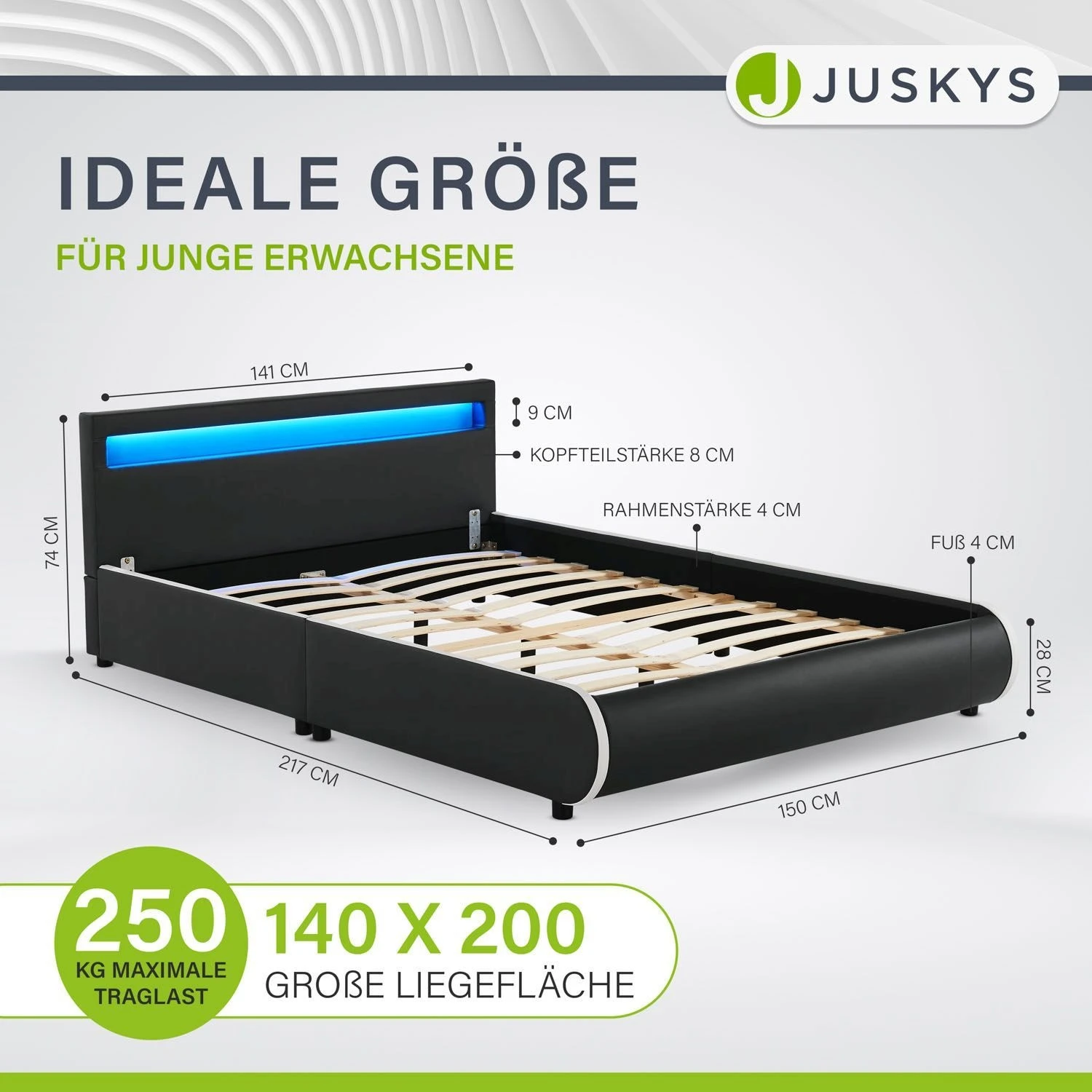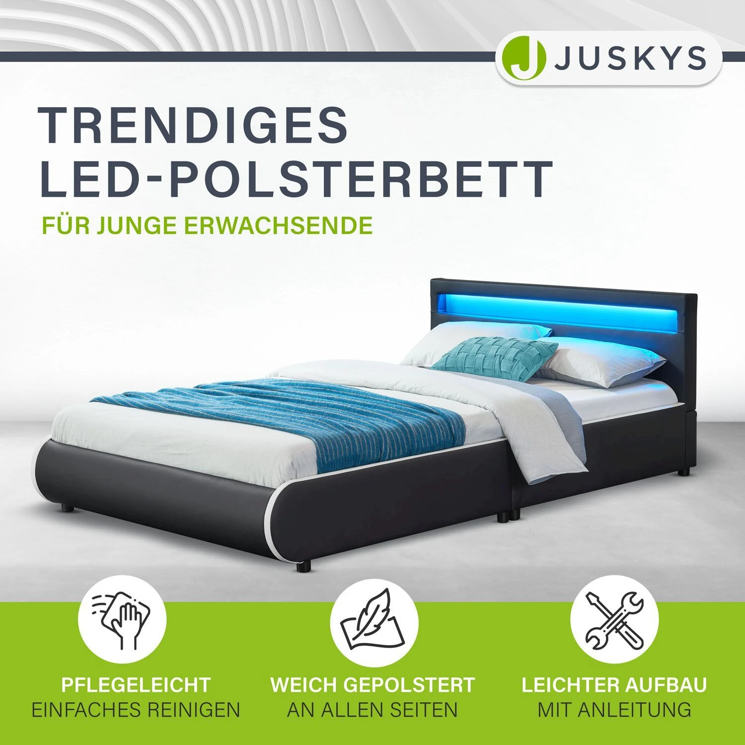 Schlafkomfort ist… beim Aufwachen festzustellen, dass es kein Traum war. Denn das Polsterbett Sevilla (140×200 cm, schwarz) ist wirklich traumhaft gemütlich und robust zugleich. Der Lattenrost bietet in Kombination mit der ergonomischen Kaltschaummatratze die ideale Basis für einen erholsamen Schlaf. Die gepolsterte Rückenlehne verfügt über eine schicke LED-Beleuchtung, die Ihr Schlafzimmer in stimmungsvolle Farben taucht. Jugendliche wie auch Erwachsene werden von der modernen Ausstattung und dem stilvollen Design überzeugt. Durch die mittlere Größe passt es auch als Doppelbett perfekt in kleine Schlaf- oder Gästezimmer.