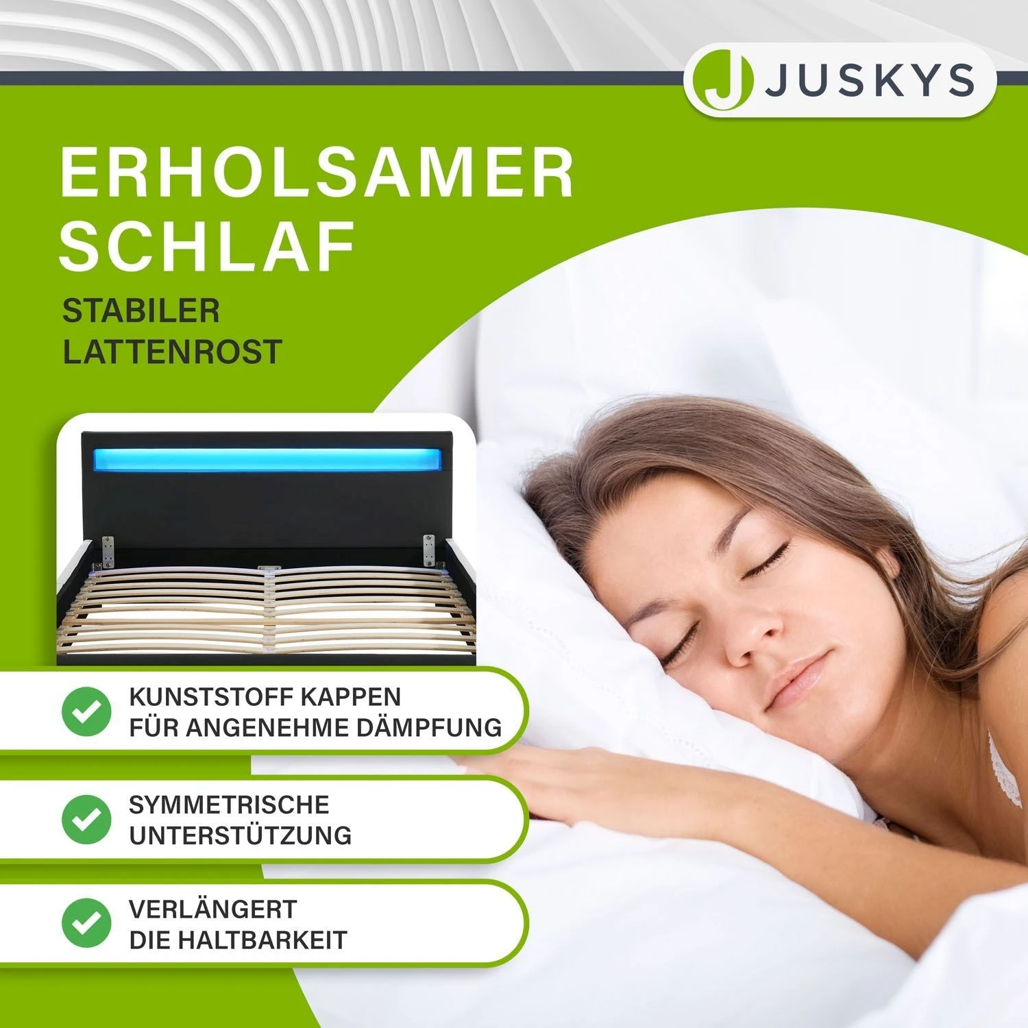Eine im Kopfteil eingelassene LED-Leiste sorgt für eine stimmungsvolle Atmosphäre im Schlafzimmer. Mit der Fernbedienung wählen Sie zwischen 16 verschiedenen Farbeinstellungen und Helligkeiten aus. Entspannen Sie bei der indirekten Beleuchtung und lassen Sie das verschiedenfarbige Licht auf sich wirken.