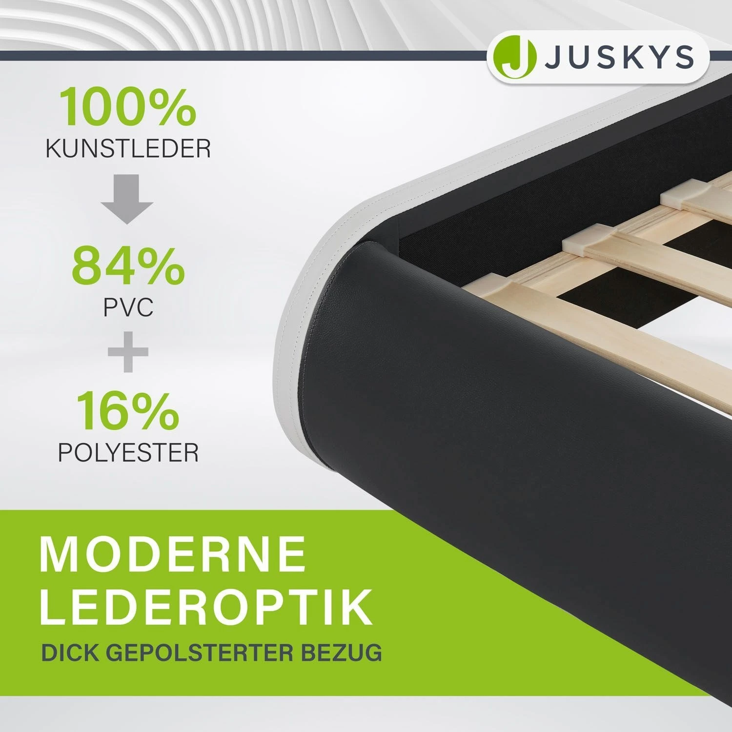 Der 149,5 × 217 cm große Bettrahmen aus MDF-Holz stützt Sie zuverlässig in Ihrem wohlverdienten Schlaf. Er ist überaus langlebig wie auch einfach im Aufbau und zudem weich gepolstert. Der Bezug aus widerstandsfähigem Kunstleder lässt sich spielend einfach mit einem feuchten Tuch reinigen.