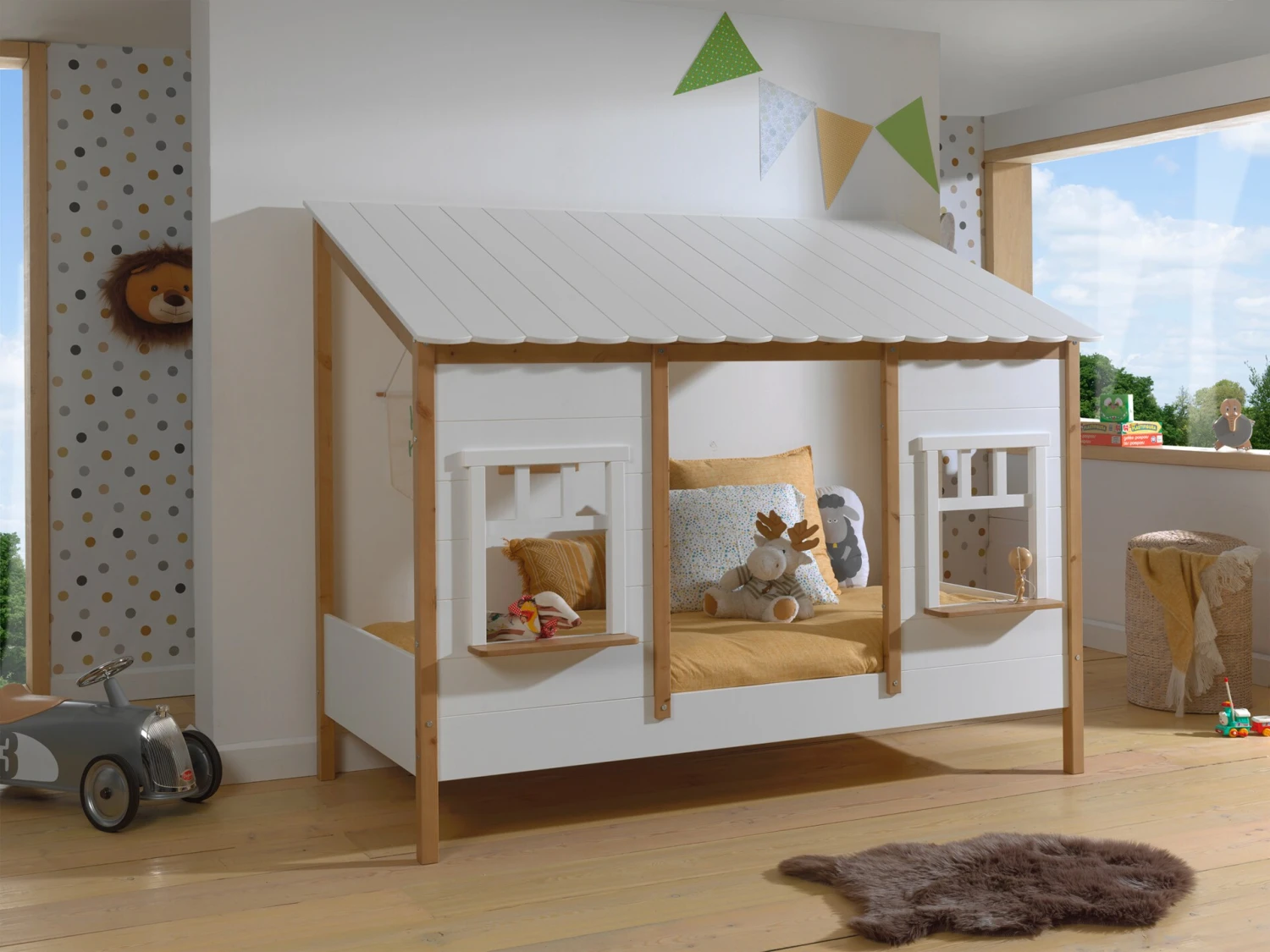 Dieses Hausbett in Landhaus-Optik, mit einer Liegefläche von 90 x 200 cm, ist ein toller Platz zum Schlafen, Spielen und Träumen. Das Trägermaterial des Bettgrundgestells ist Kiefer massiv lackiert, in „Oak-Color„. Dieser warme Farbton bildet einen angenehmen Kontrast zu der weißen Front. Diese ist wie eine Hausfassade in geplankter Optik aufwändig gestaltet.