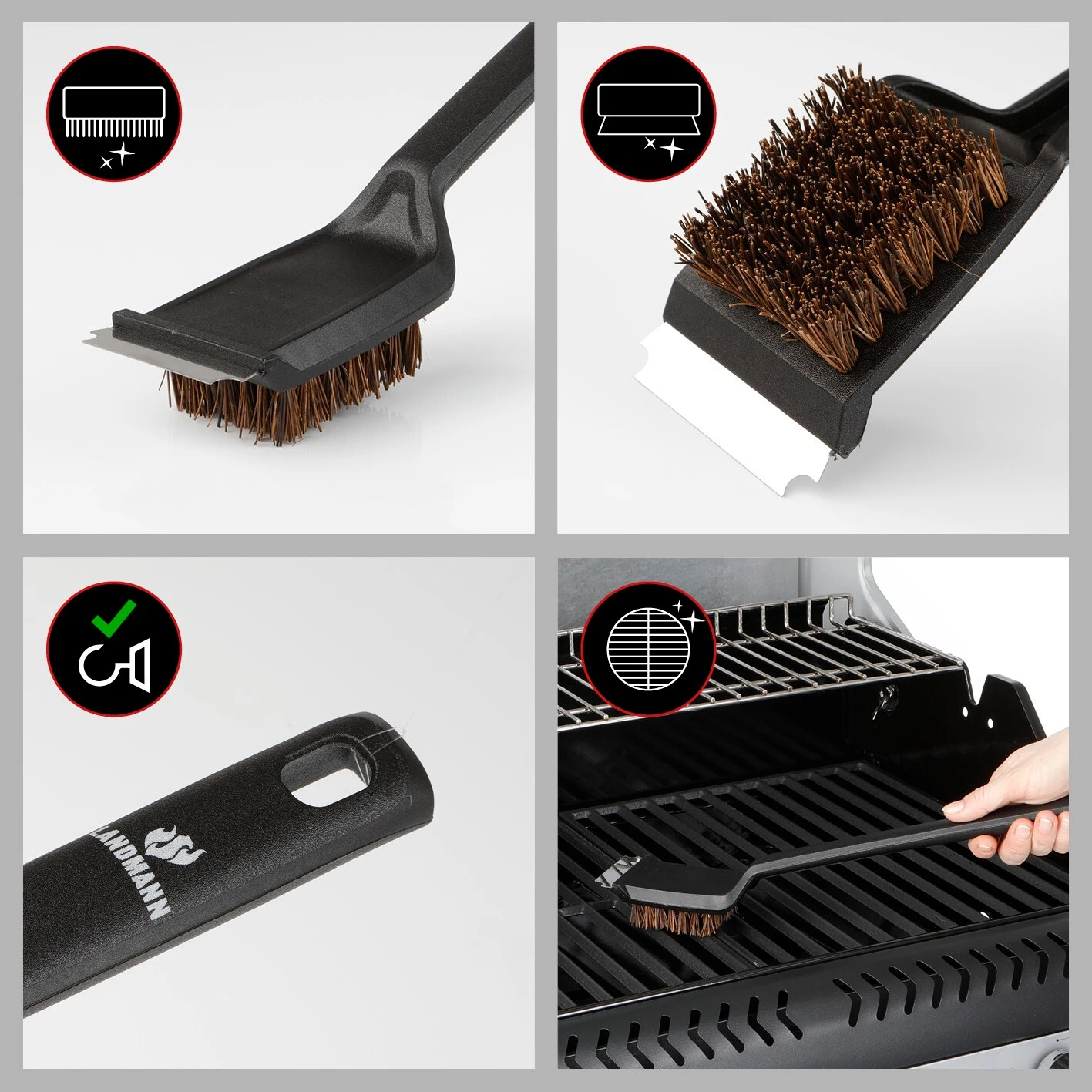 Bevor das nächste Barbecue starten kann, muss immer erst der Grill auf Hochglanz gebracht werden. Mit der Reinigungsbürste AG-II-104BKXX von LANDMANN funktioniert das Saubermachen nicht nur bequem, sondern es schont zusätzlich auch den Grillrost deines Gas-, Holzkohle- oder Elektrogrills. Denn die Palmyra-Borsten reinigen sanft, aber gründlich und sind außerdem nur bedingt hitzebeständig. Sollte sich beim Reinigen also eine Borste lösen oder abbrechen, dann verbrennt sie beim nächsten Grillen rückstandslos, anstatt sich auf deinem Grillgut wiederzufinden – ein klarer Vorteil gegenüber Metallborsten. Der im Bürstenkopf integrierte Edelstahlschaber ermöglicht zusätzlich die einfache Reinigung von besonders verkrusteten Grillrosten und ist jederzeit griff- und einsatzbereit. Mit der Reinigungsbürste AG-II-104BKXX von LANDMANN kannst du das nächste Grillen also ganz bestimmt noch mehr genießen.