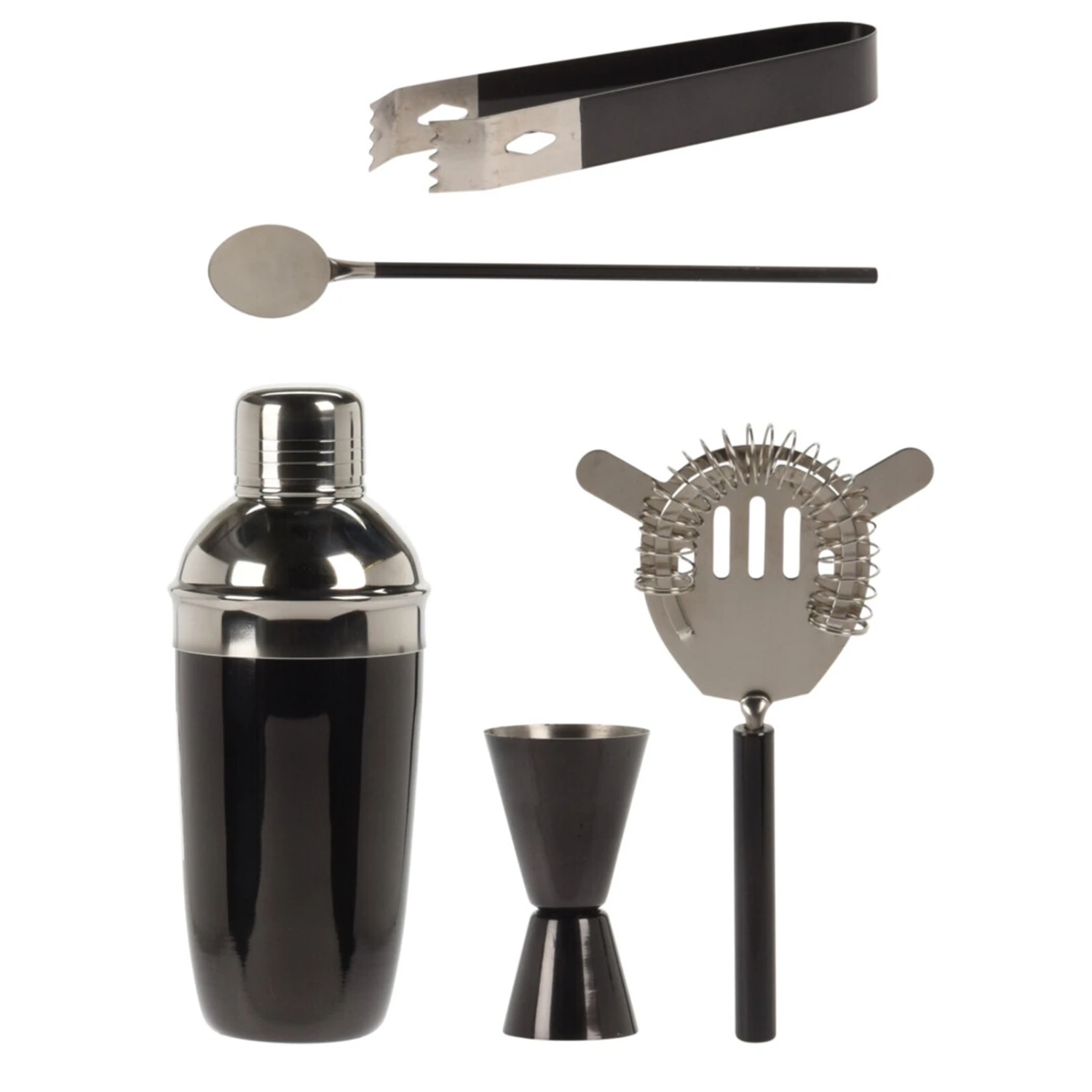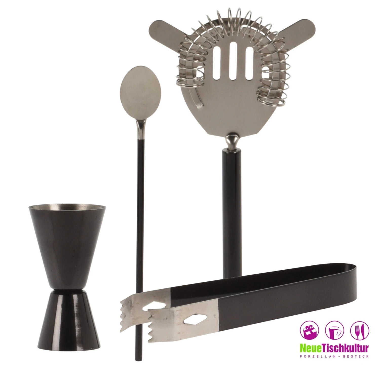 Ein schönes und elegantes Set zum Cocktails zubereiten: Das Set ist aus Edelstahl und in Schwarz-Silber gehalten. Es besteht aus Cocktailshaker, Messbecher (Jigger), Rührlöffel, Sieb und Zange.