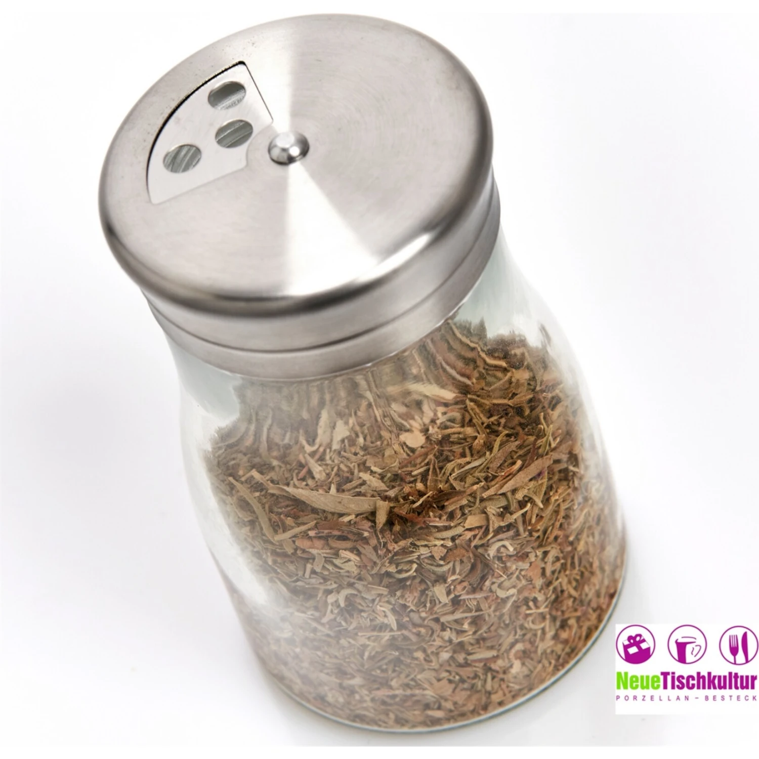 Der praktische Gewürzstreuer kann mit Ihren Lieblingsgewürzen befüllt werden. Dank der integrierten Drehscheibe im Deckel können Sie eine von 3 Lochgrößen wählen, damit der Inhalt genau dosiert ist. Im verschlossenen Behälter verlieren Ihre Kräuter und Gewürze nicht an Geschmack. Das Glas gibt Ihnen immer einen guten Überblick über Inhalt und die Füllmenge. Das Glas kann in der Spülmaschine gereinigt werden, für den Deckel bitte nur ein feuchtes Tuch verwenden. Maße Ø 6 cm, Höhe 9,5 cm