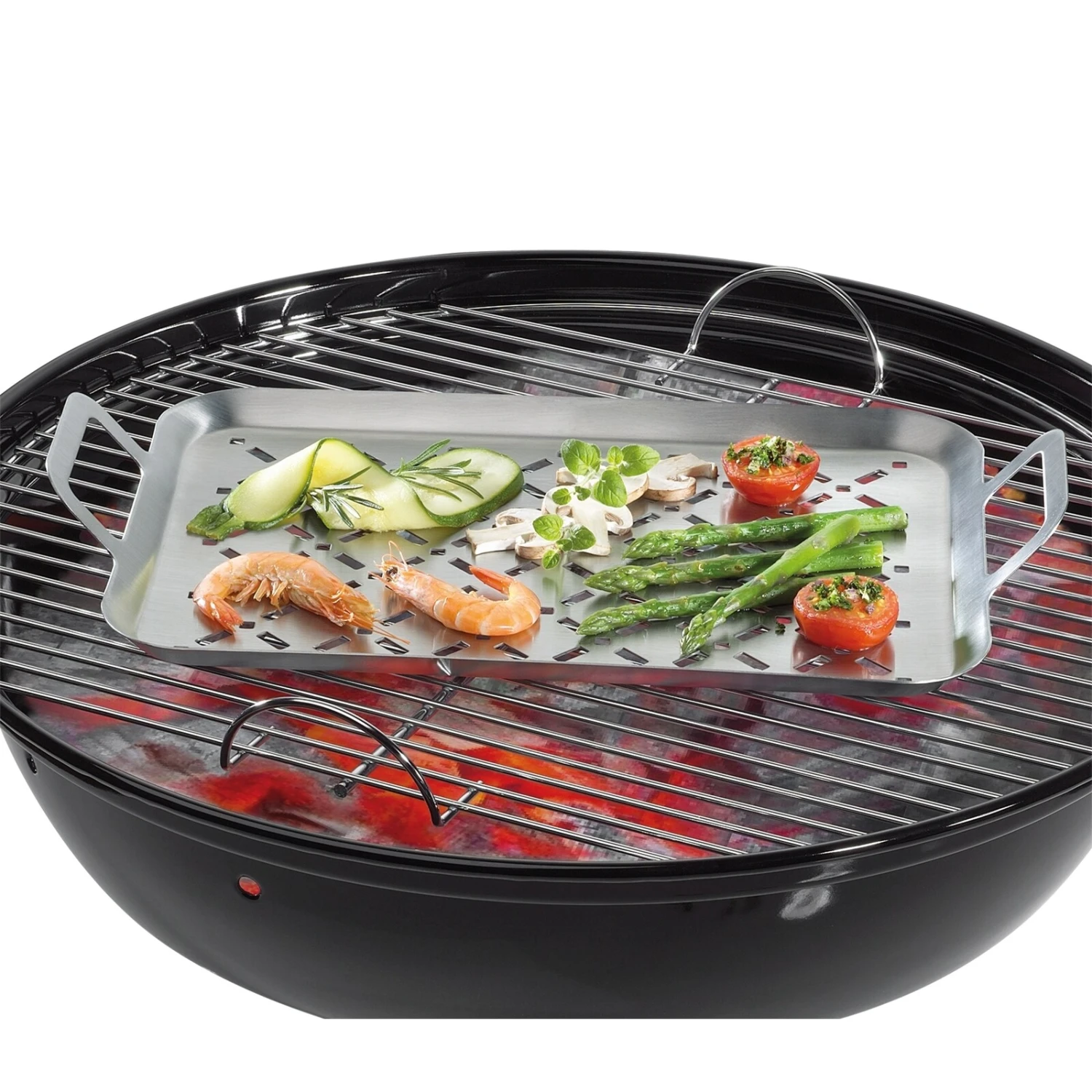 Gemüse, Fisch oder auch feine Hähnchenbrüste sind nicht so einfach zu grillen. Schnell bleiben diese Lebsnmittel am Gitter kleben oder fallen in die Glut. Mit der Grillplatte ist das ein Problem von gestern: durch die Löcher kommen die Röstaromen ans Grillgut, an dem rostfreien Edelstahl bleibt nichts so schnell kleben. Die umweltverträgliche Alternative zur Aluschale!