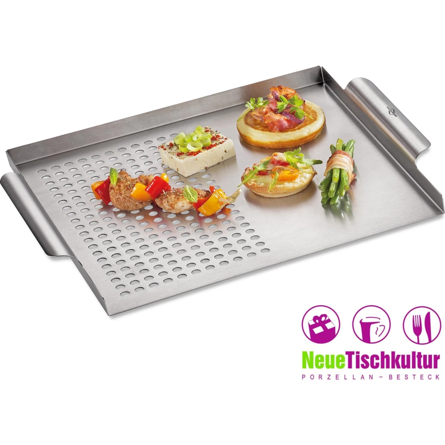Die Grillplatte ist Ideal zum Grillen von Fisch, Fleisch und Gemüse und hat eine Geschlossene und gelochte Fläche. Die wiederverwendbare Grillschale ist aus rostfreiem Edelstahl und mißt 38 x 21 cm.