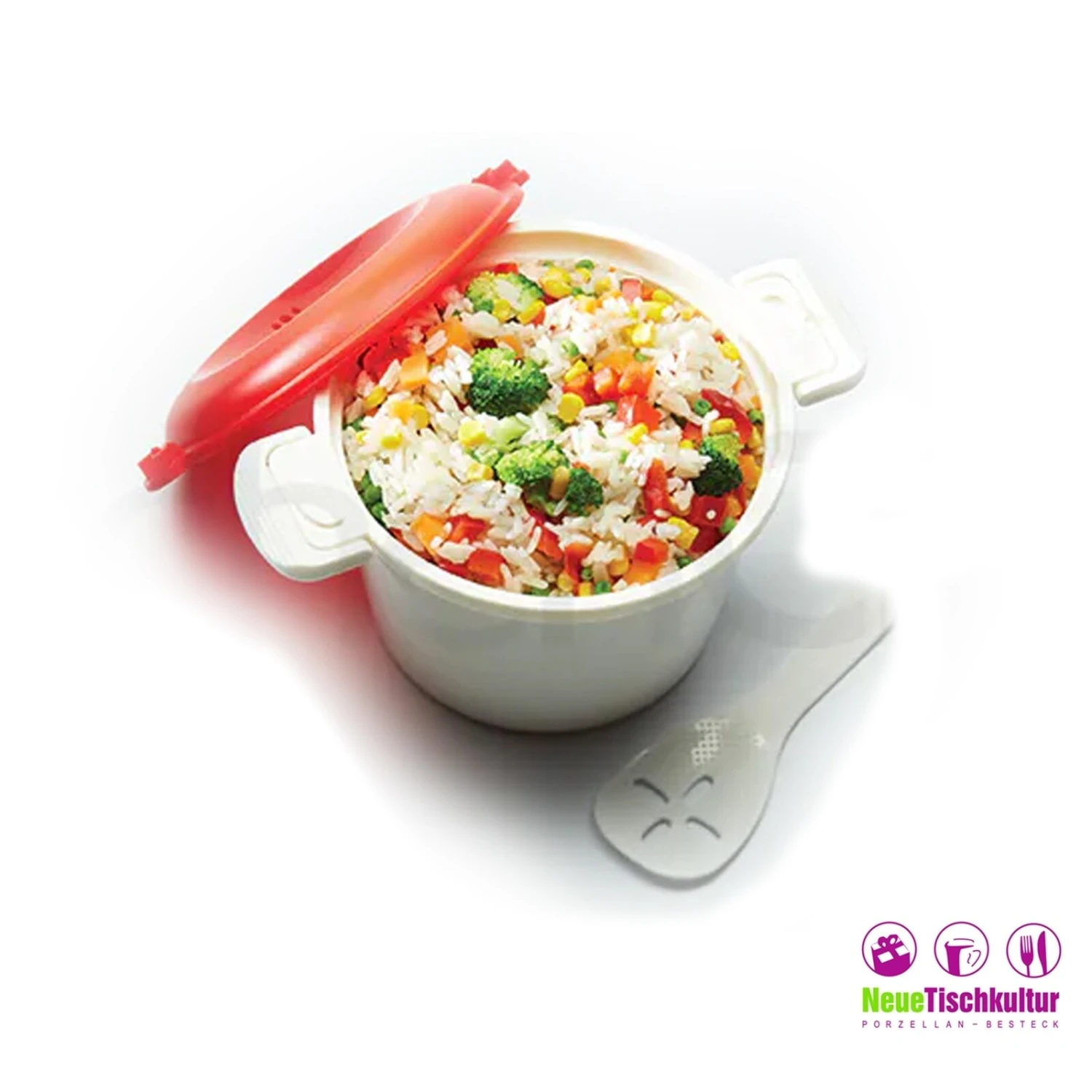 Der Reiskocher aus hitzebeständigem Kunststoff besteht aus 5 Teilen: Behälter, Deckel, Messbecher, Rührlöffel und Einsatz. Der praktische Reiskochtopf kombiniert Mikrowellentechnologie mit traditioneller orientalischer Küche für schnelles und einfaches Reis kochen in der Mikrowelle. Die Dampfzirkulation sorgt für eine gleichmäßige Erwärmung der Speisen bei gleichbleibender Feuchtigkeit. Die Teile sind Mikrowellengeeignet bis 120°C und im Kühl-/Gefrierschrank bis – 18 °C sowie Spülmaschinengeeignet. Nutzinhalt: 1,5 Liter