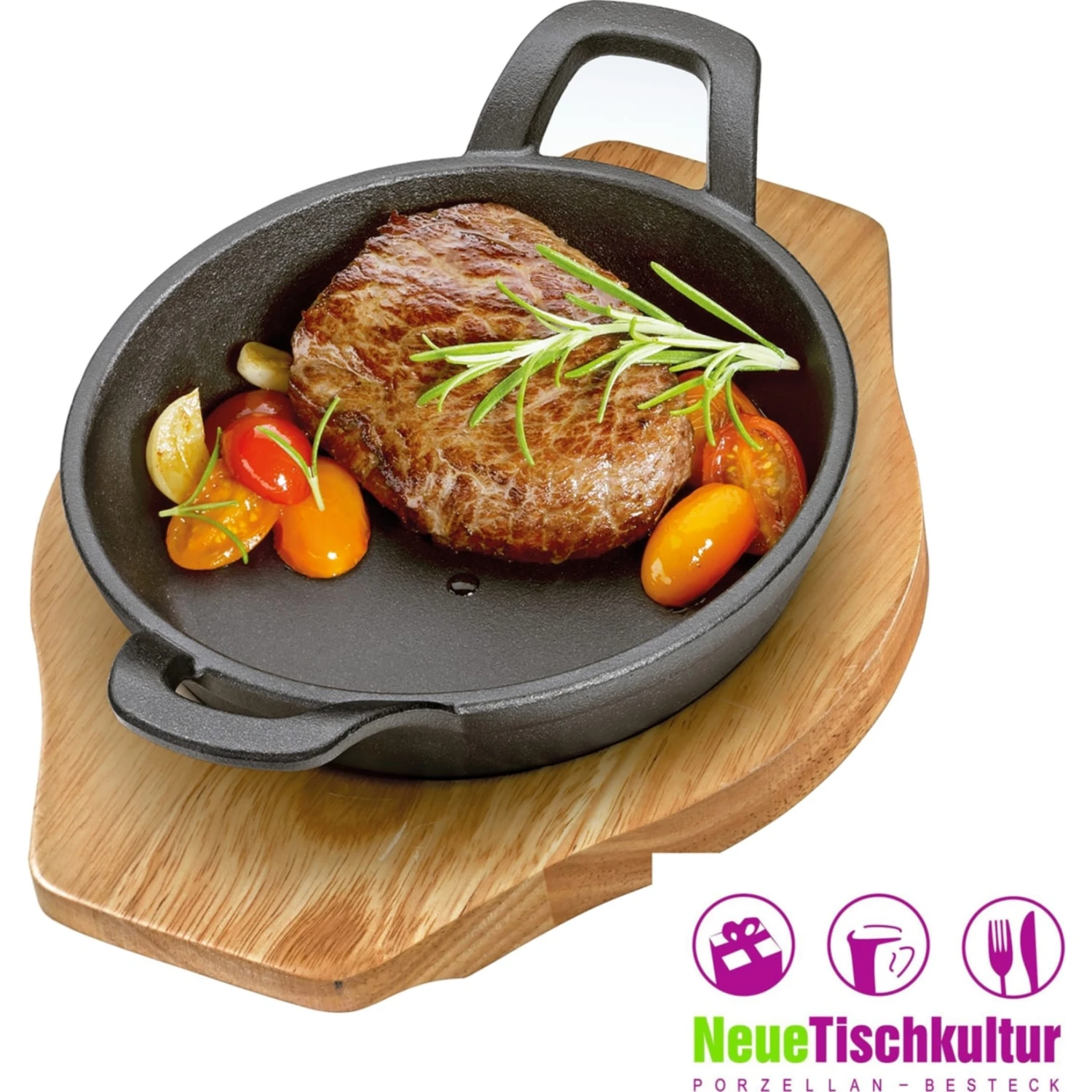 In diesem Set, bestehend aus einer runden Pfanne mit 2 Griffen inklusive dem passenden Holzbrett, kann man super Speisen und Beilagen zubereiten wie Gemüse, Ziegenkäse oder sogar Meeresfrüchte. Das ganze kann in servierfertigen Portionen auf allen Herdarten, inklusive Grill zubereitet werden. An dem stabilen Griff transportieren Sie die Grillpfanne, das Brett aus Pinienholz ist ideal zum stilvollen Servieren. Clever: Eine Mulde in dem runden Brett hält die Pfanne sicher. Maße der Pfanne: L/B/H 18,5 x 24 x 5,5 cm
