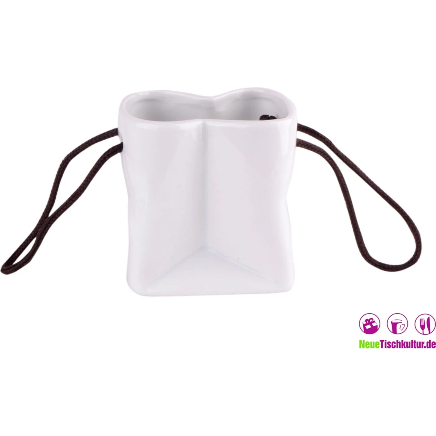 Dieses außergewöhnliche Gefäß ist eine Servierschale, welche die Form einer Tüte oder Tasche hat. Das ist ganz sicher der Knaller auf Ihrem gedeckten Tisch! Die Servierschale ist aus Keramik und hat zwei „Trageriemen“ aus beweglichem Material. So sieht das ganze täuschend echt aus. Maße: 7,5 x 7 cm