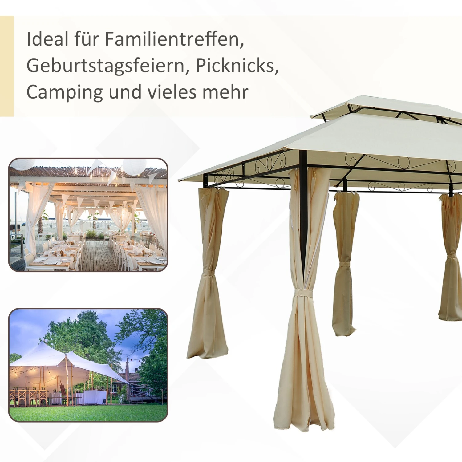 Sichern Sie sich mit diesem geschmackvollen, qualitativ hochwertigen Pavillon einen sicheren, geschützten Platz zum Entspannen. Ihr Luxuspavillon steht auf einem formschönen, pulverbeschichteten Stahlgestell. Es überzeugt durch Wertigkeit, Robustheit und widersteht der Witterung. Das wasserabweisende Doppeldach ist aus 180 g/m² starkem Polyester gefertigt. Damit bietet es perfekten Schutz vor Regen und intensiver Sonneneinstrahlung. Regenwasser wird problemlos über die 8 integrierten Ösen am Dachrand abgeleitet. Für Sicht- und Windschutz sorgen die milchweißen Seitenteile, die sich bequem per Reißverschluss öffnen und schließen lassen. So genießen Sie Ihren Sommer in vollen Zügen, mit Ihrem stilvollen Luxus Pavillon.