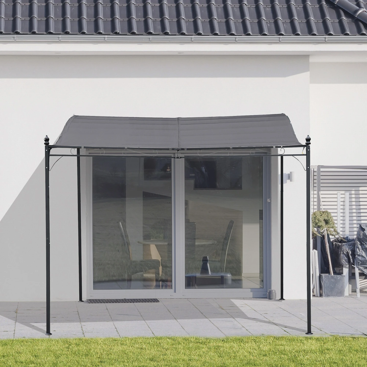 Unsere Pergola ist nicht nur aufrgund der hohen Qualität, sondern auch wegen des einzigartigen Designs sehr zu empfehlen. Dank des modernen Designs und der offenen Struktur kann sie als Gartenpavillon, Terrassenüberdachung oder Vordach eingesetzt werden. Bei der Planung und Herstellung der Pergola wurden 4 Ösen berücksichtigt, die sich am Dachrand befinden, sodass das Regenwasser abfließen kann. Bei Bedarf besteht die Möglichkeit, die Premium Terrassenüberdachung mit Hilfe von Schrauben an der Wand zu befestigen. Somit ist sie insbesonders für den Eingangs- oder Fensterbereich geeignet, wobei sie ausreichend Schutz vor direkter Sonneneinstrahlung bietet. Nehmen Sie unsere elegante Pergola mit geschwungenem Dach und genießen Sie die Schatten spendende Kühle darunter in Ihrem Garten, Terrasse oder Hof.