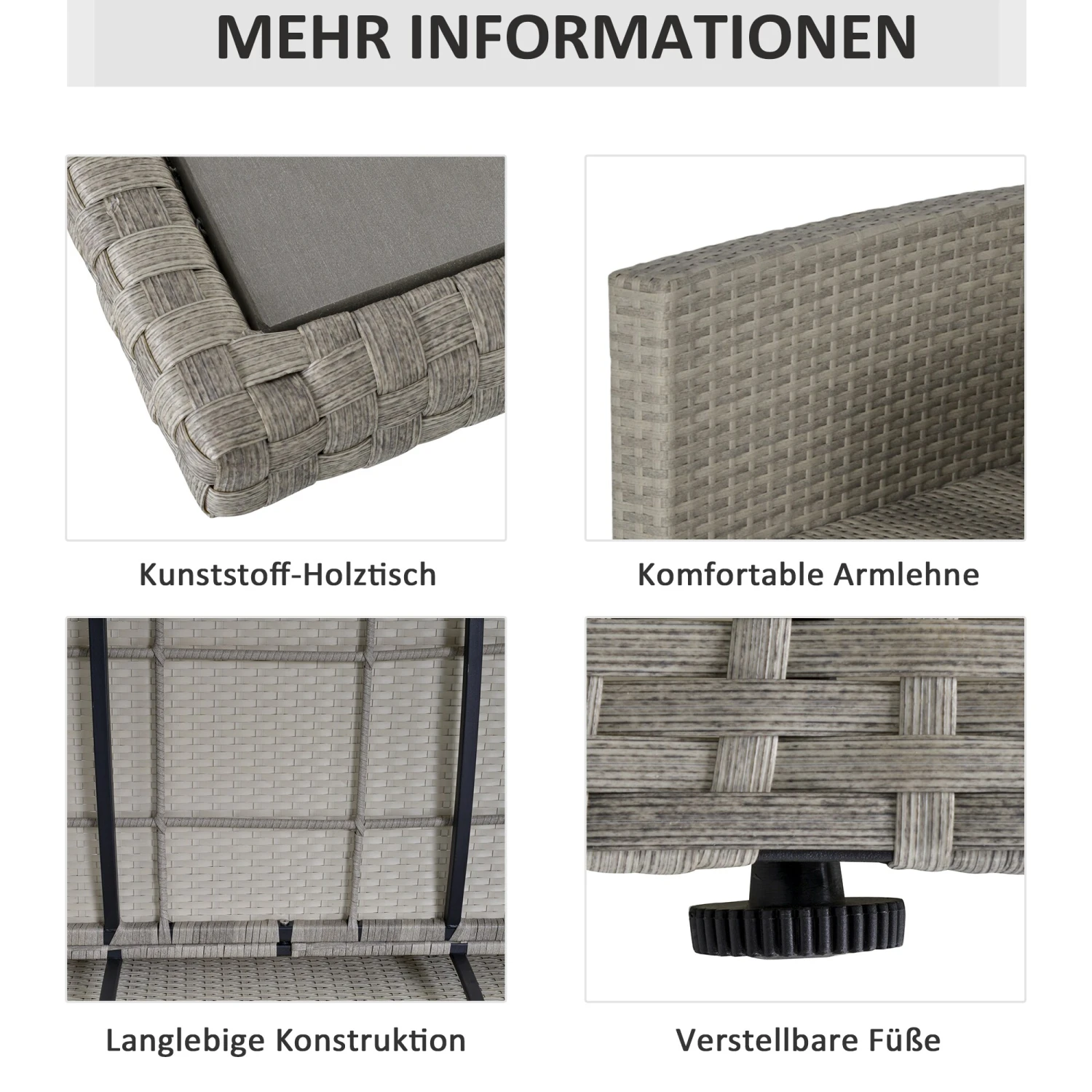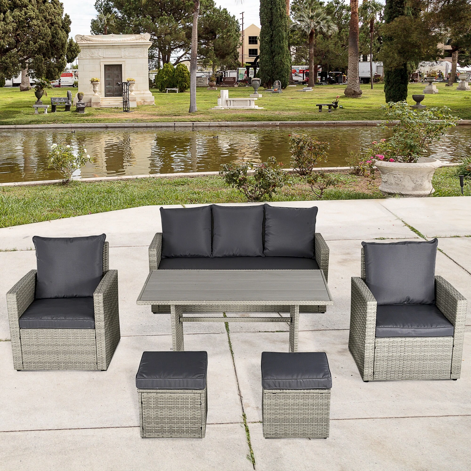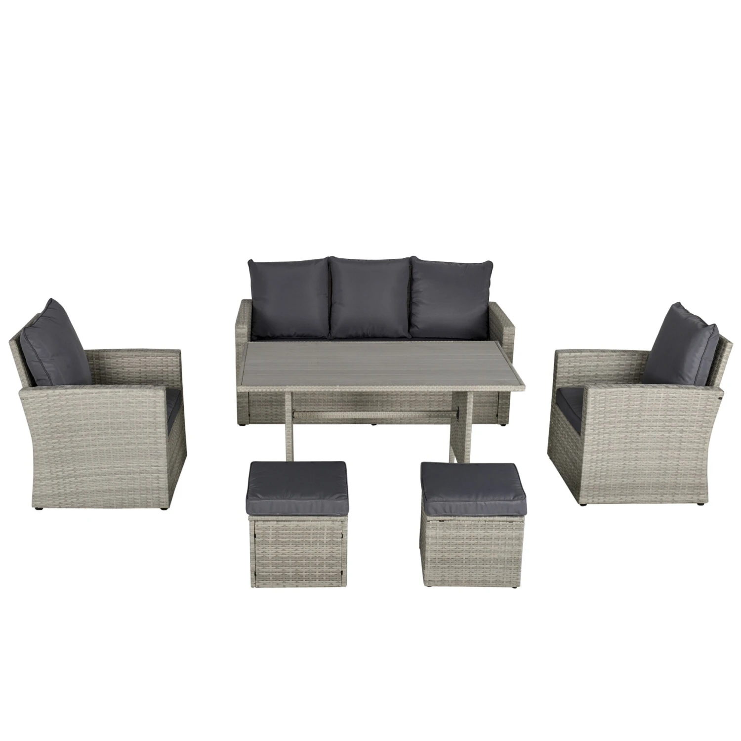 - Lieferumfang: 1 x Dreisitzer-Sofa, 2 x Einzelsofa, 1 x Esstisch, 2 x Fußhocker, 5 x Sitzkissen, 5 x Rückenkissen
