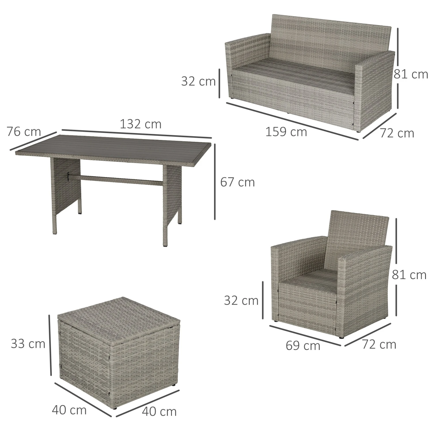 - Maße: Dreisitzer-Sofas: 159 x 72 x 81 cm (LxBxH), Einzelsofa: 69 x 72 x 81 cm (LxBxH), Esstisch: 132 x 76 x 67 cm (LxBxH), Fußhocker: 40 x 40 x 33 cm (BxTxH)