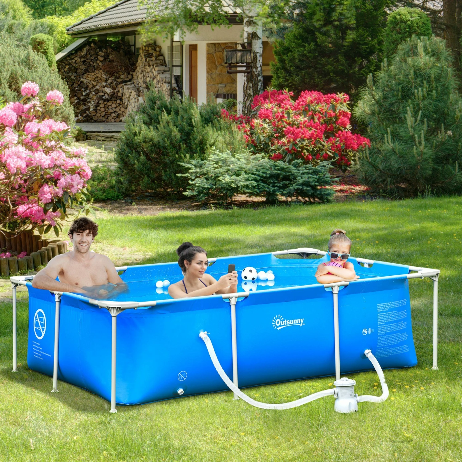- Lieferumfang: 1 x Rahmenpool, 1 x Filterpumpe, 2 x Stopfen, Selbstklebender Reparaturkleber, Dreiwegeventil, 1 x Anleitung