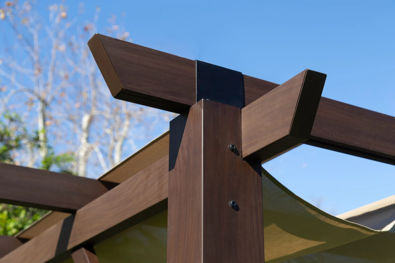 Der Pavillon besteht aus einer rostresistenten Aluminiumkonstruktion: sehr stabil, wartungsfrei und langlebig. Der Clou: Die täuschend echtwirkende Holzoptik verleiht dem Pavillon ein ausgesprochen edles Design und passt sich optisch in jeden Garten oder jede Terrasse an.