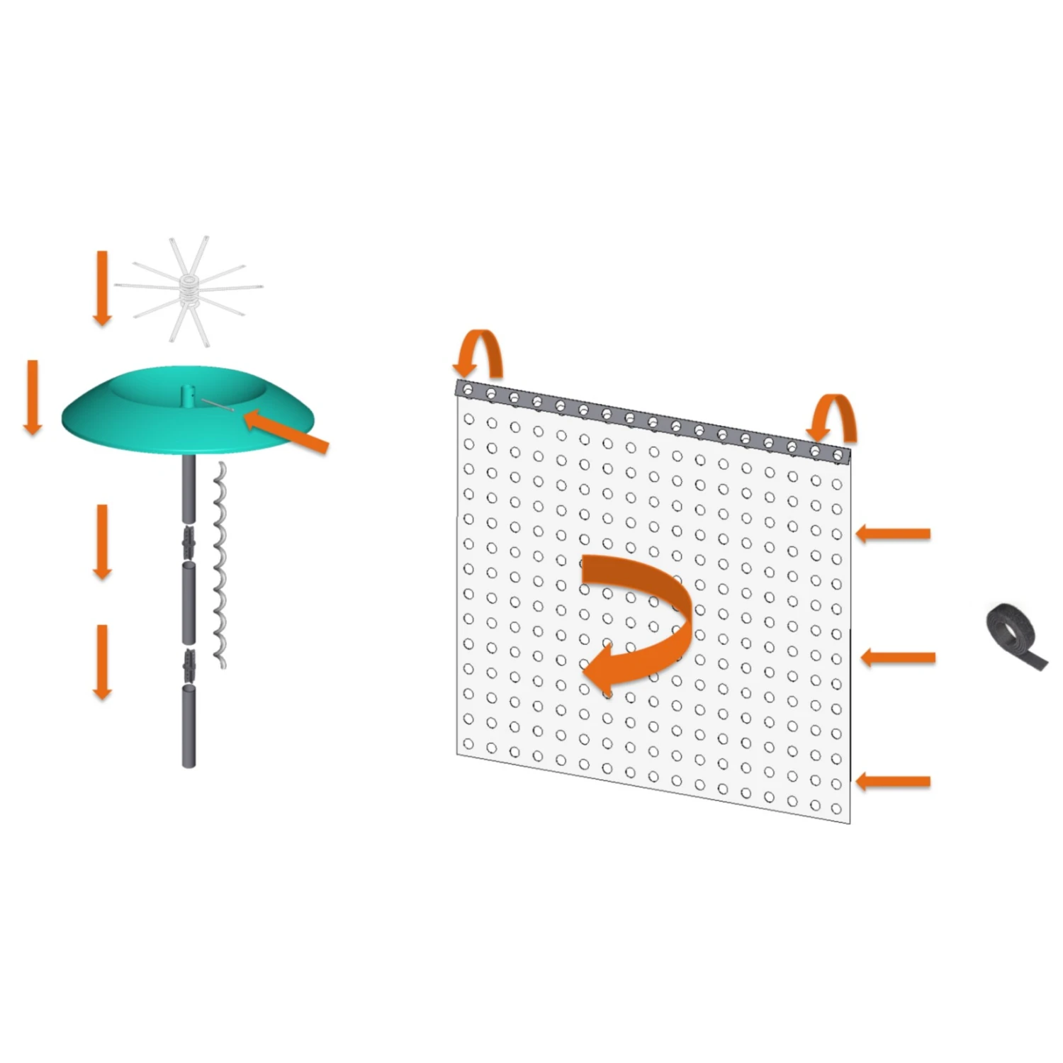 Das Set beinhaltet zwei Tomatenhüte mit Rohr und Bewässerungsschläuchen, zwei Schutzfolien mit Folienhaltern und Bedienungsanleitung.