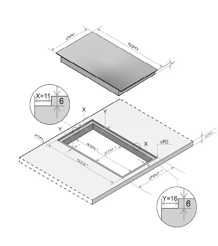 - Abmessungen Aussägung Kochfeld Breite 27,00 cm