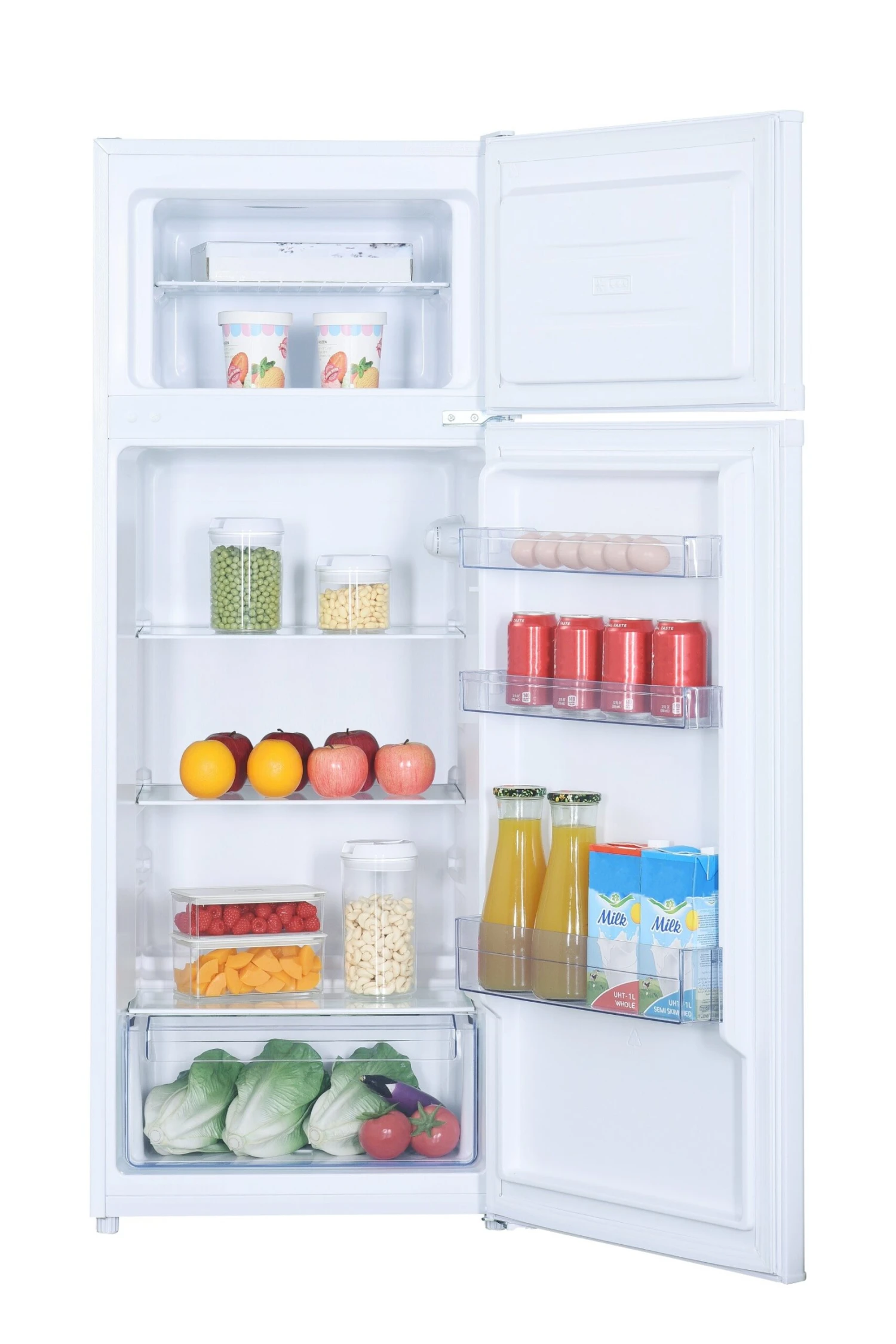 Drei Türfächer bieten Platz für Flaschen und Saucen. Mit den zwei verstellbaren Glasebenen hat ein dein Haushalt mehr als genug Stauraum im Kühlbereich. Inklusive Gemüseschublade für frische Lebensmittel.