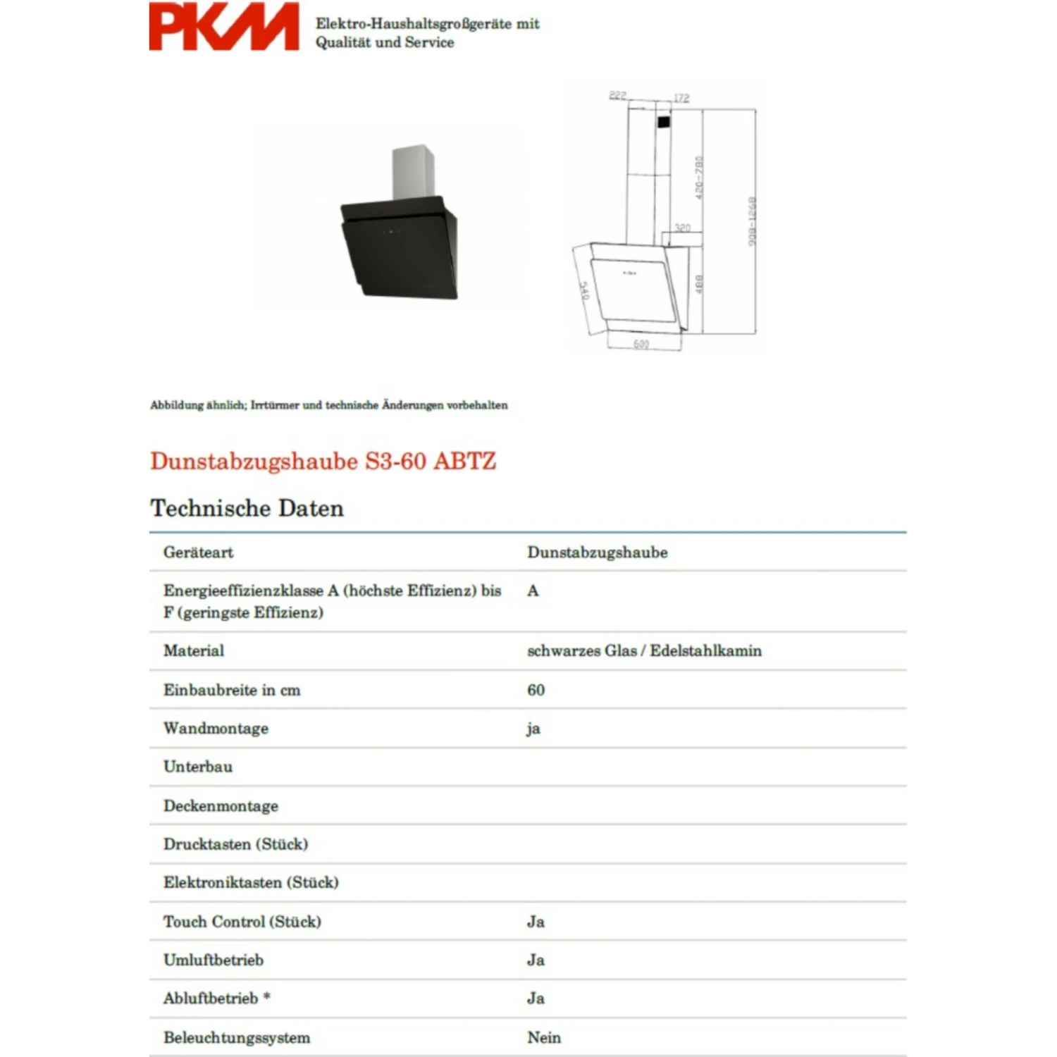 PKM S3-60 ABTZ Dunstabzugshaube – 60cm Kopffreihaube aus schwarzem Glas / Edelstahl