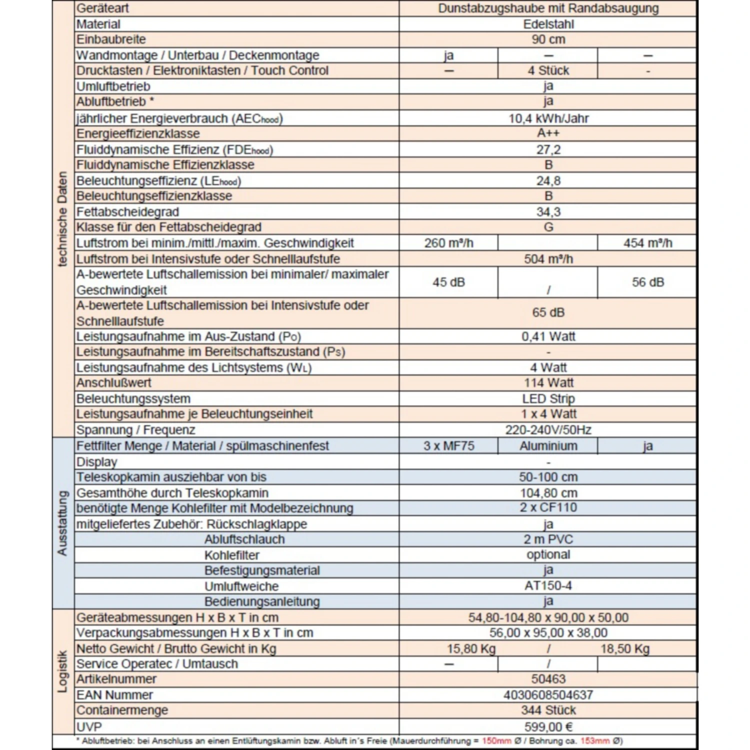 Luftstrom bei Intensivstufe oder Schnelllaufstufe: 504 m³/h