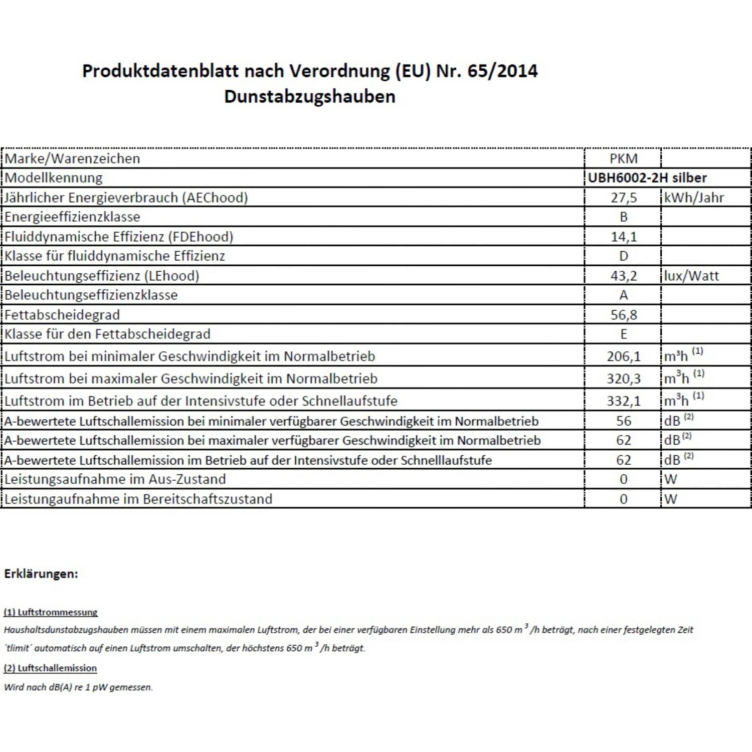 PKM UBH6002-2H 60 cm Dunstabzugshaube Flachschirmhaube / Einbauhaube Edelstahlblende
