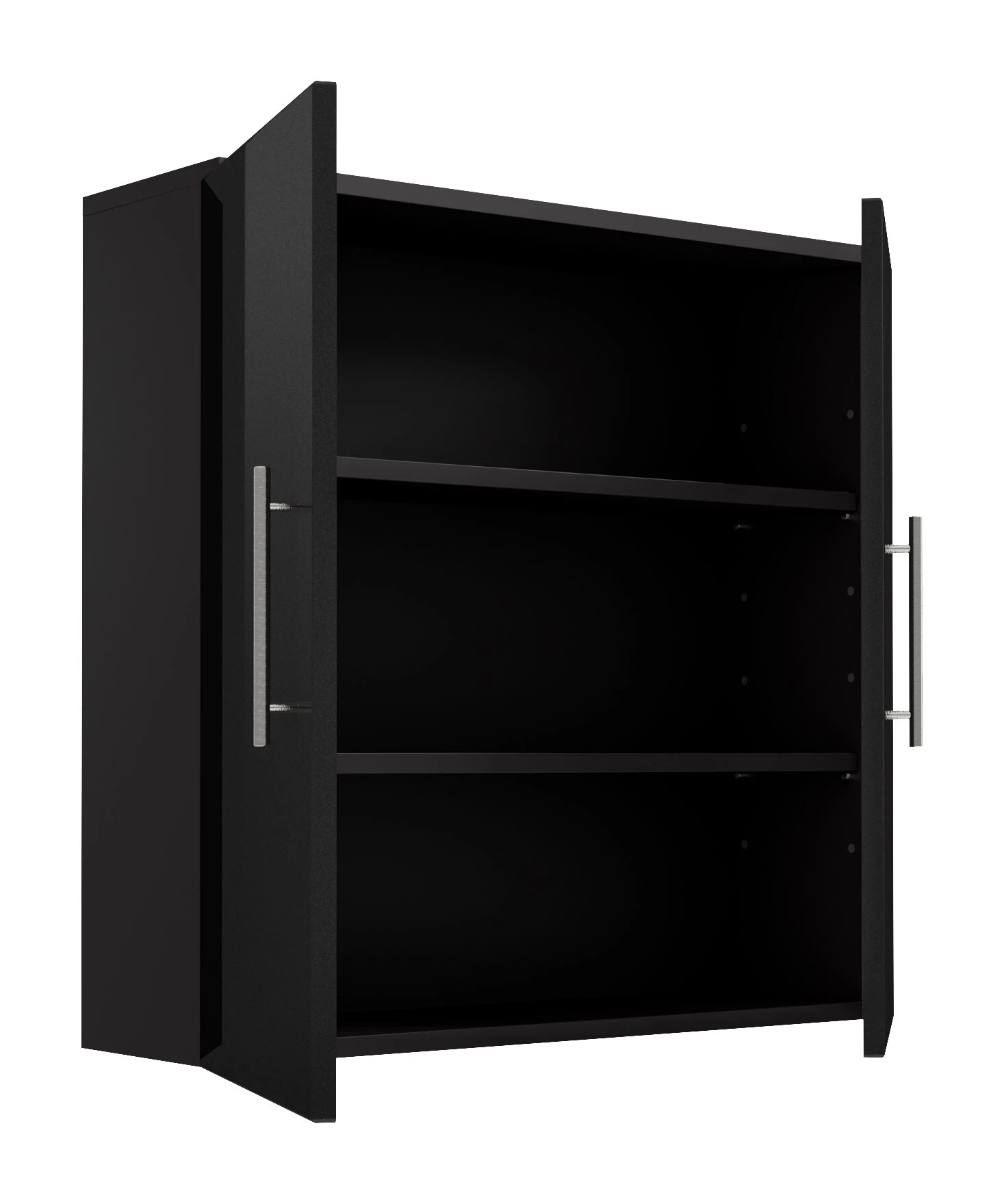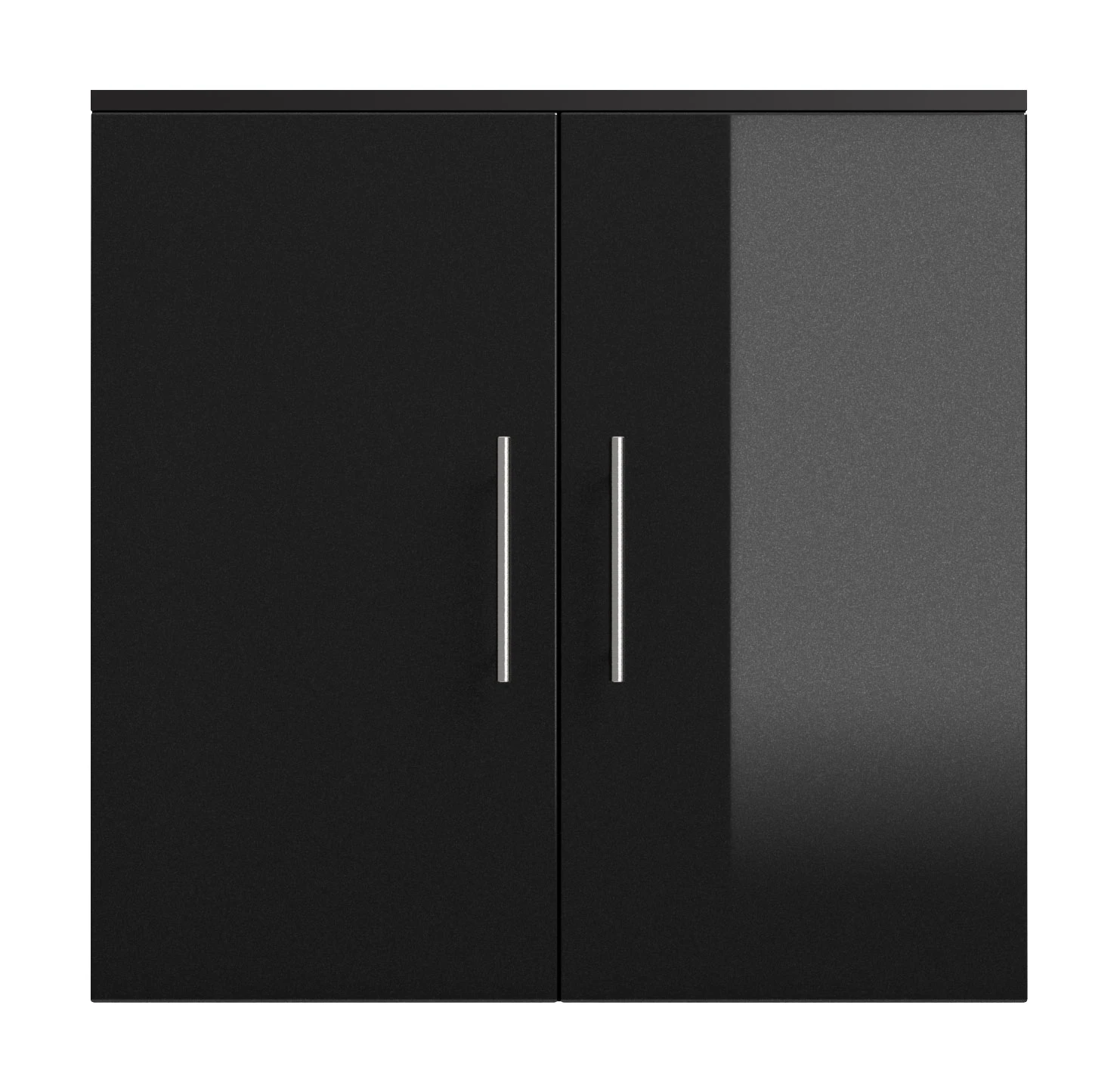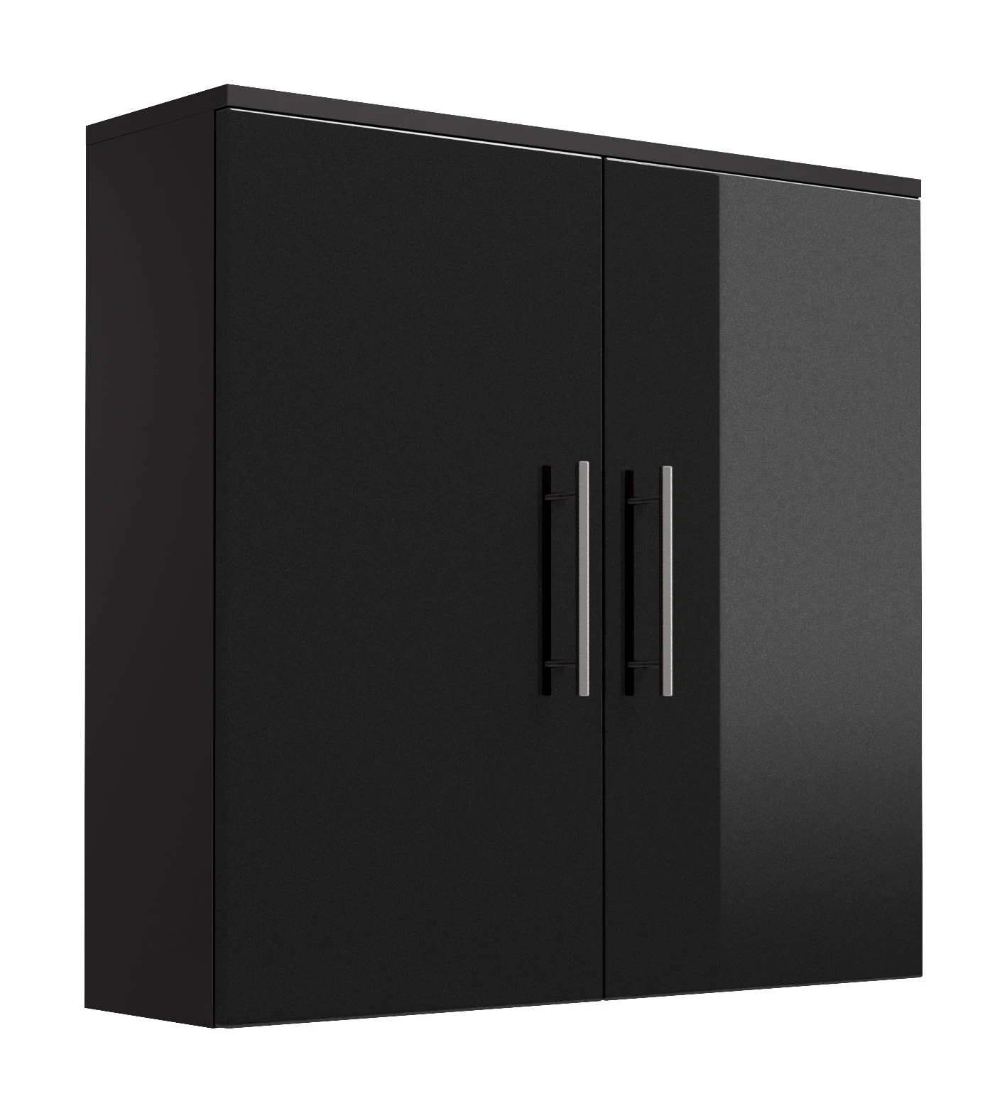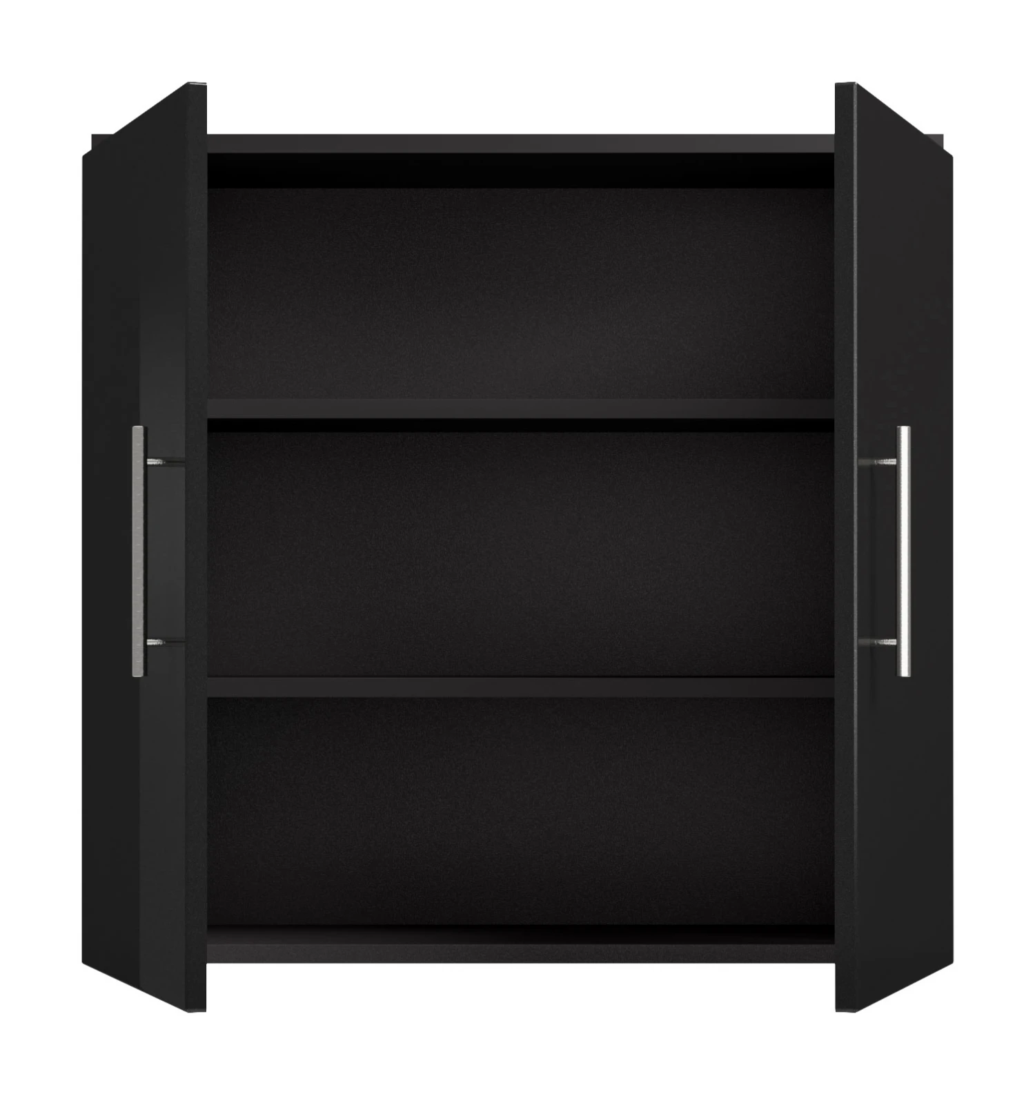 Dieser Hängeschrank bietet hinter seinen beiden Türen zwei variabel einsetzbare Einlegeböden und Metallgriffe.