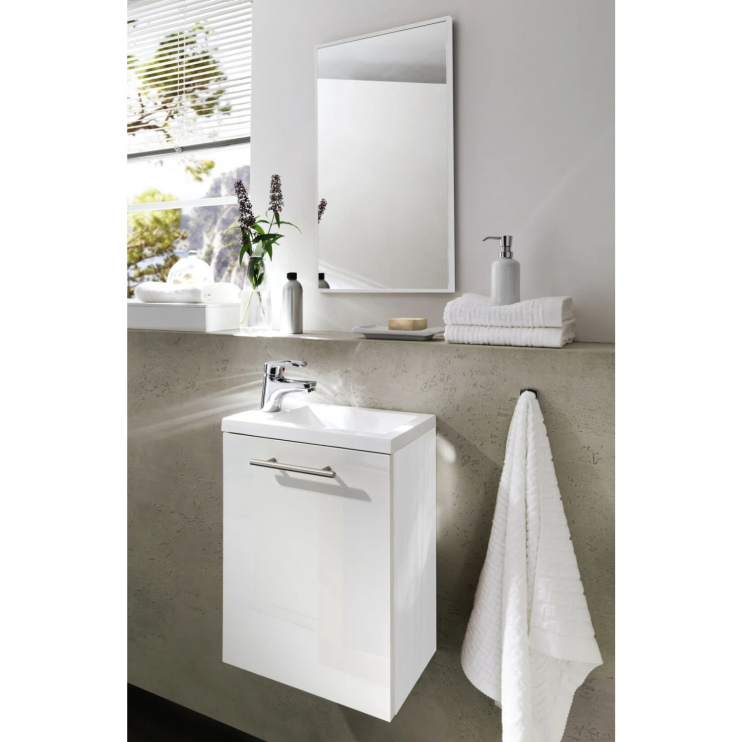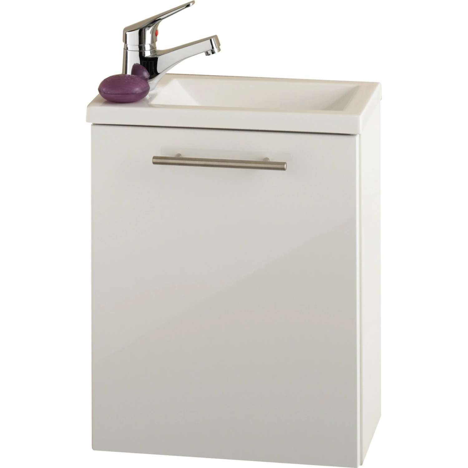 Das Modell verfügt über einen Echtmetallgriff und ein Mineralguss-Becken, die Türe ist beidseitig anschlagbar.